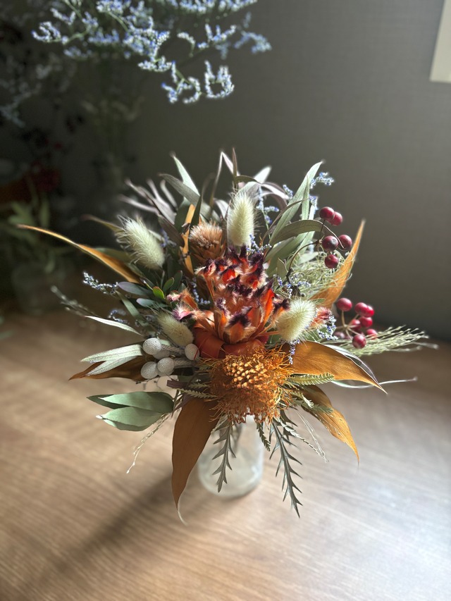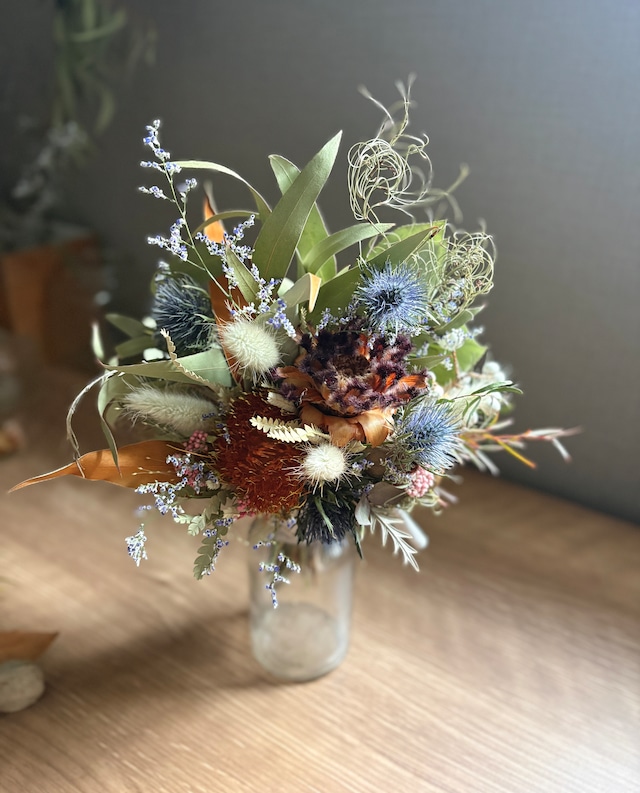 プロテアとユーカリのスワッグ。 フォルモーサ、グレビレアゴールド、リューカデンドロン、ベルガムナッツ、エリンジウムなどネイティブプランツもたっぷり束ねたスワッグに仕上げました。 縦、横、斜めとお好みの角度に調節可能。 ブーケとしてもお楽しみいただけます。 size 縦約27㎝ 横約27㎝ 【お取り扱いについて】 自然素材の特性により、日々色味の変化が見られます。ドライフラワーならではの風合いや色合いの深まりを、ぜひお楽しみください。 直射日光や湿気が苦手な商品ですので、湿気の多い場所での使用や保管には十分にご注意いただけますようお願い申し上げます。カビが発生する可能性もあるため、心配される方は特にご注意ください。 配送時やディスプレイ時には、花や葉が落ちる場合がございます。この点についても、あらかじめご理解いただけますようお願い申し上げます。
