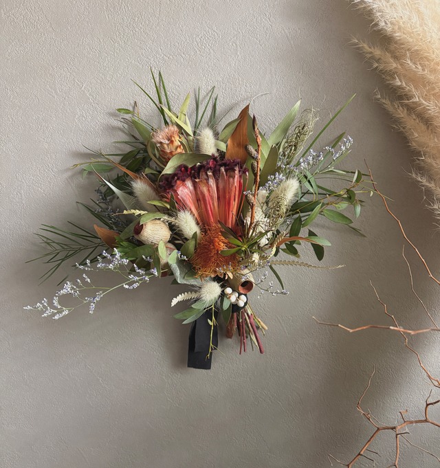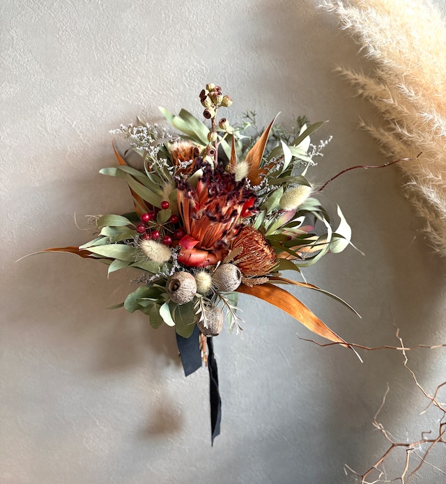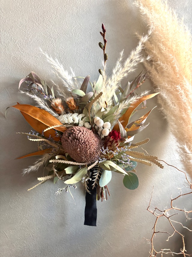 プロテアとバンクシアのスワッグ。 ユーカリをベースに、グレビレアゴールド、パンパスグラス、ブルニア、リューカデンドロンなどネイティブプランツをたっぷり束ねボリューム感のあるスワッグに仕上げました。 お好きな角度に調節可能。 ブーケとしてもお楽しみいただけます。 size 縦約42㎝ 横約32㎝ 【お取り扱いについて】 自然素材の特性により、日々色味の変化が見られます。ドライフラワーならではの風合いや色合いの深まりを、ぜひお楽しみください。 直射日光や湿気が苦手な商品ですので、湿気の多い場所での使用や保管には十分にご注意いただけますようお願い申し上げます。カビが発生する可能性もあるため、心配される方は特にご注意ください。 配送時やディスプレイ時には、花や葉が落ちる場合がございます。この点についても、あらかじめご理解いただけますようお願い申し上げます。