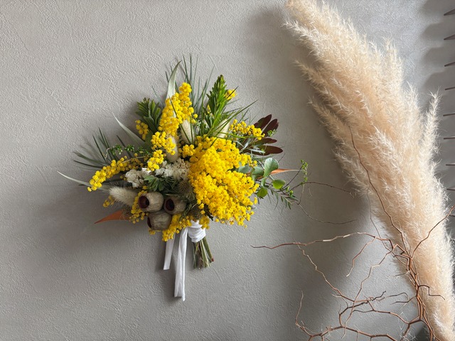 ミモザとユーカリのスワッグ。 優しいミモザのイエローとベルガムナッツ、リューカデンドロンなどを合わせて甘すぎないミモザスワッグに仕上げました。 縦、横、斜めとお好きに角度に調節可能。 ブーケとしてもお楽しみいただけます。 size 縦約34㎝ 横約31㎝ ミモザは大変繊細なお花です。日々ドライ化が進みます。 配送時の花落ち、葉落ちなどご容赦下さいませ。 【お取り扱いについて】 自然素材の特性により、日々色味の変化が見られます。ドライフラワーならではの風合いや色合いの深まりを、ぜひお楽しみください。 直射日光や湿気が苦手な商品ですので、湿気の多い場所での使用や保管には十分にご注意いただけますようお願い申し上げます。カビが発生する可能性もあるため、心配される方は特にご注意ください。 配送時やディスプレイ時には、花や葉が落ちる場合がございます。この点についても、あらかじめご理解いただけますようお願い申し上げます。