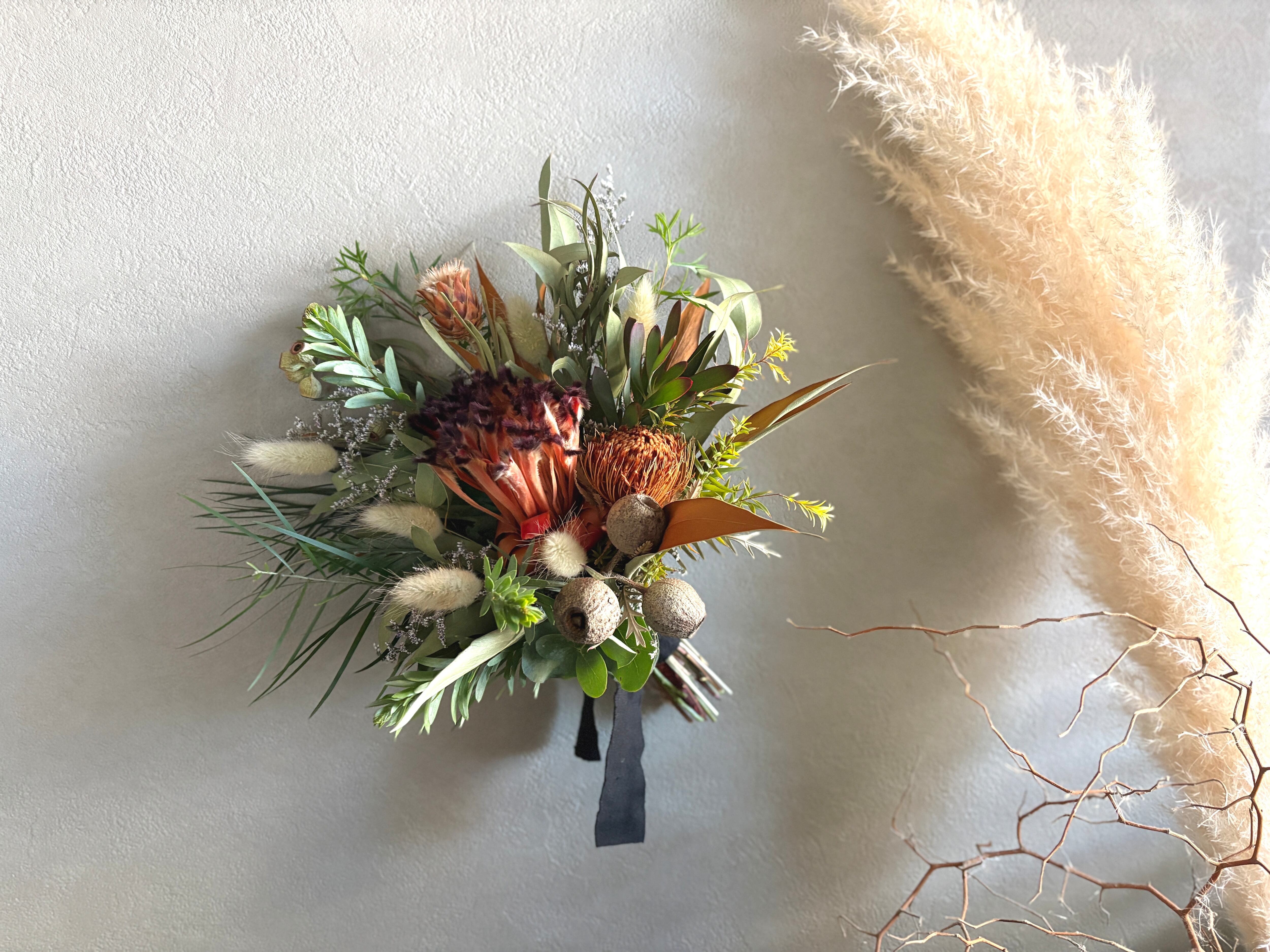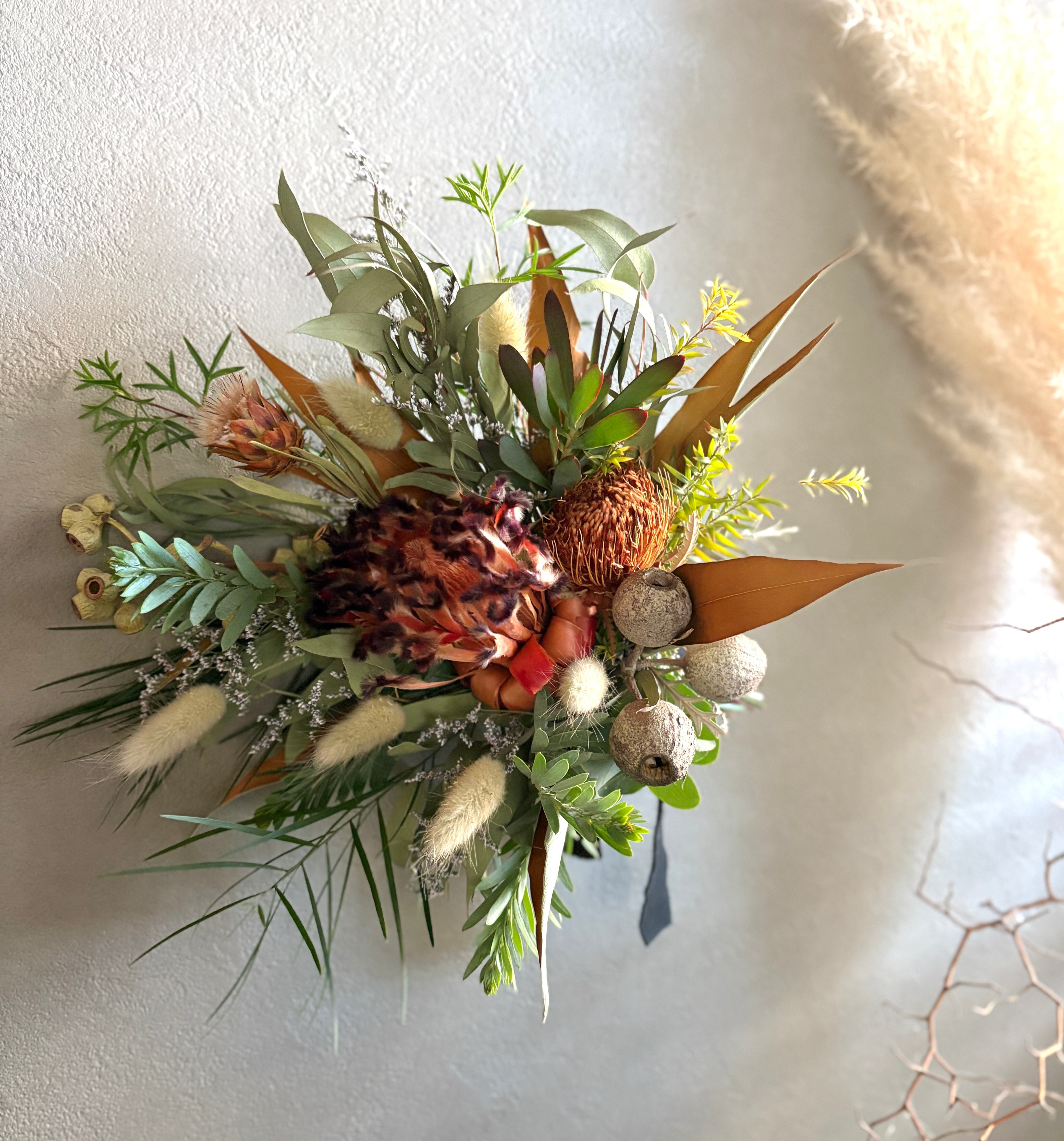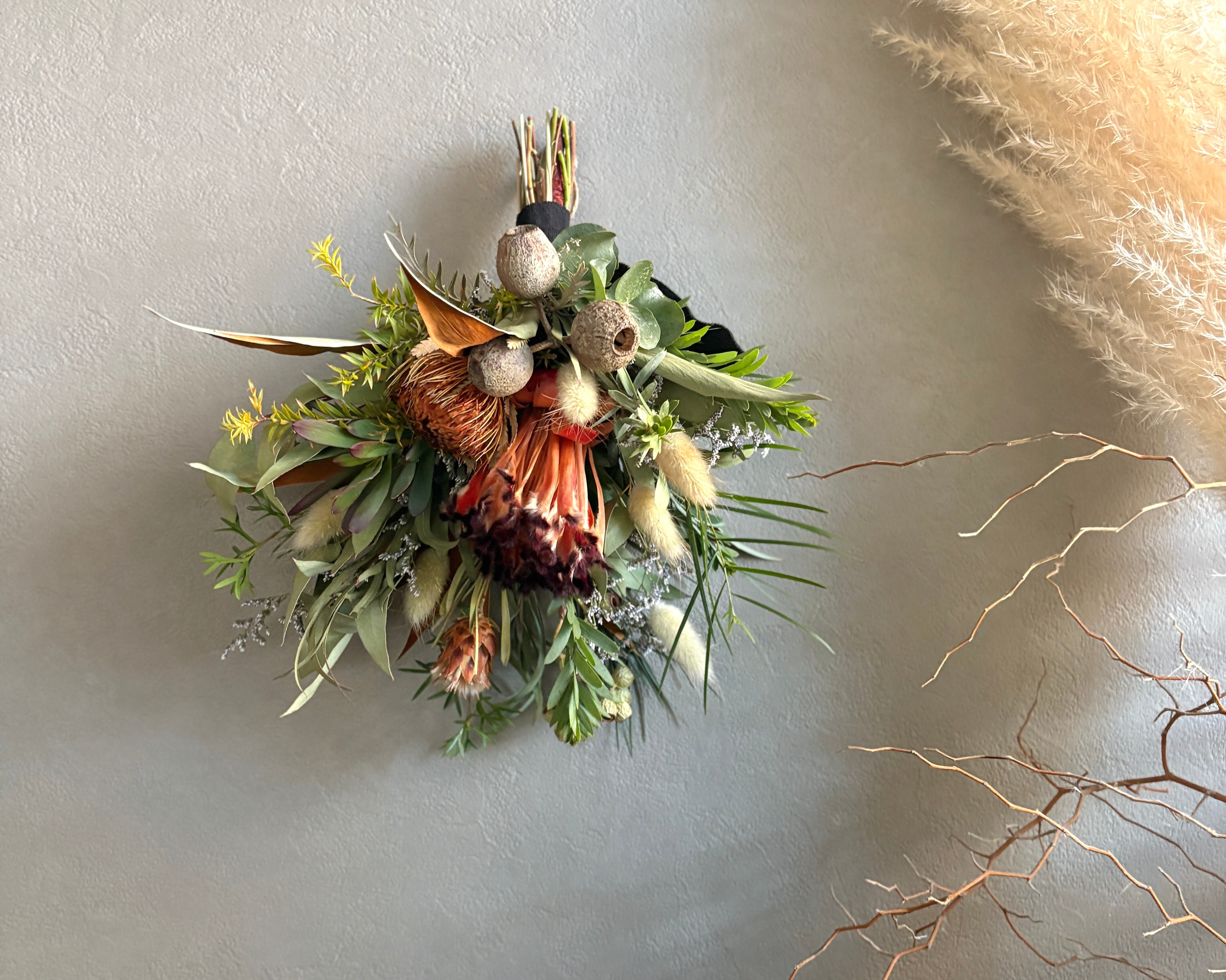 フォルモーサ、グレビレアゴールド、ベルガムナッツ、リューカデンドロンなどネイティブプランツもたっぷり束ねて、暖かみのあるスワッグに仕上げました。