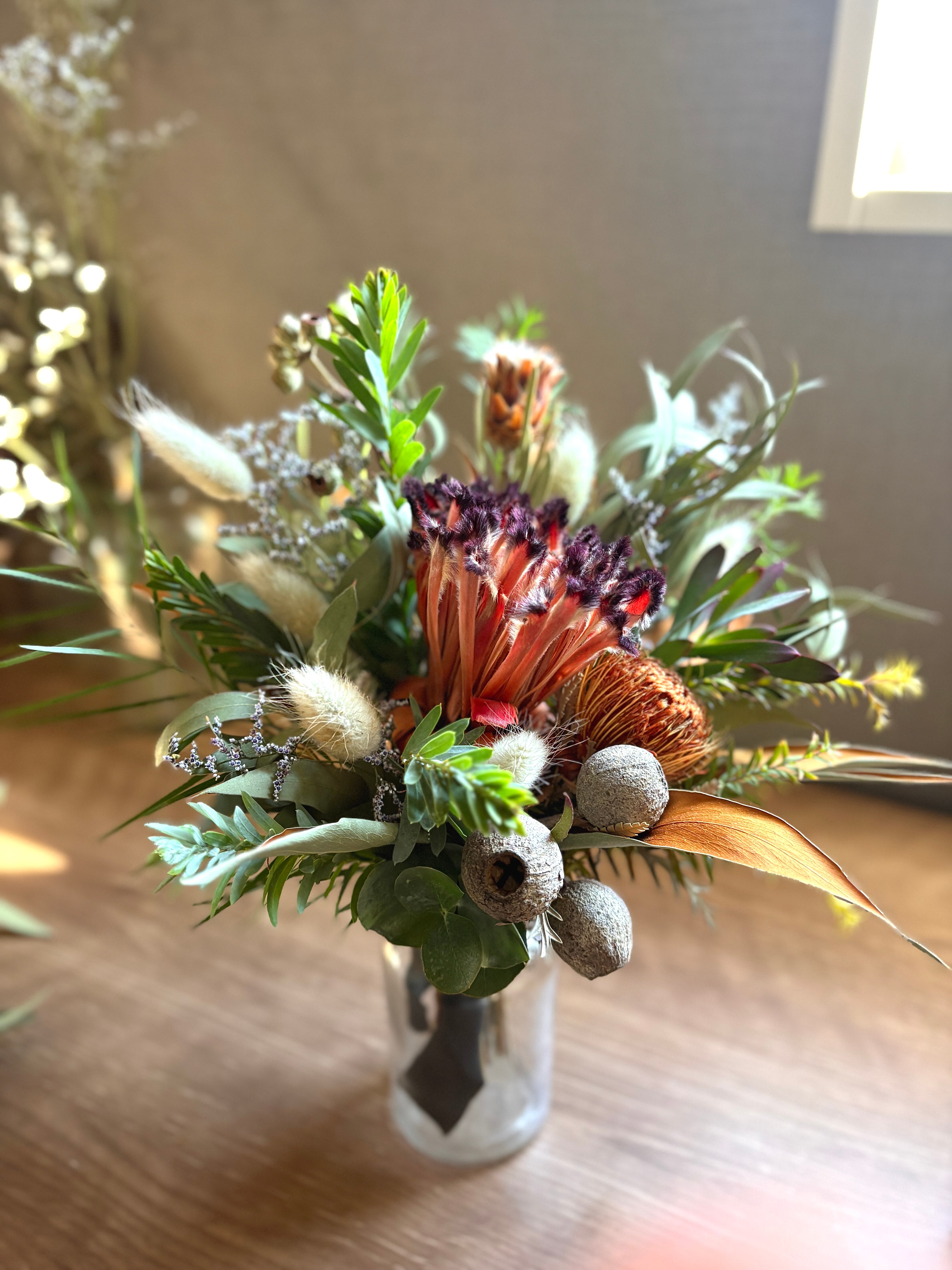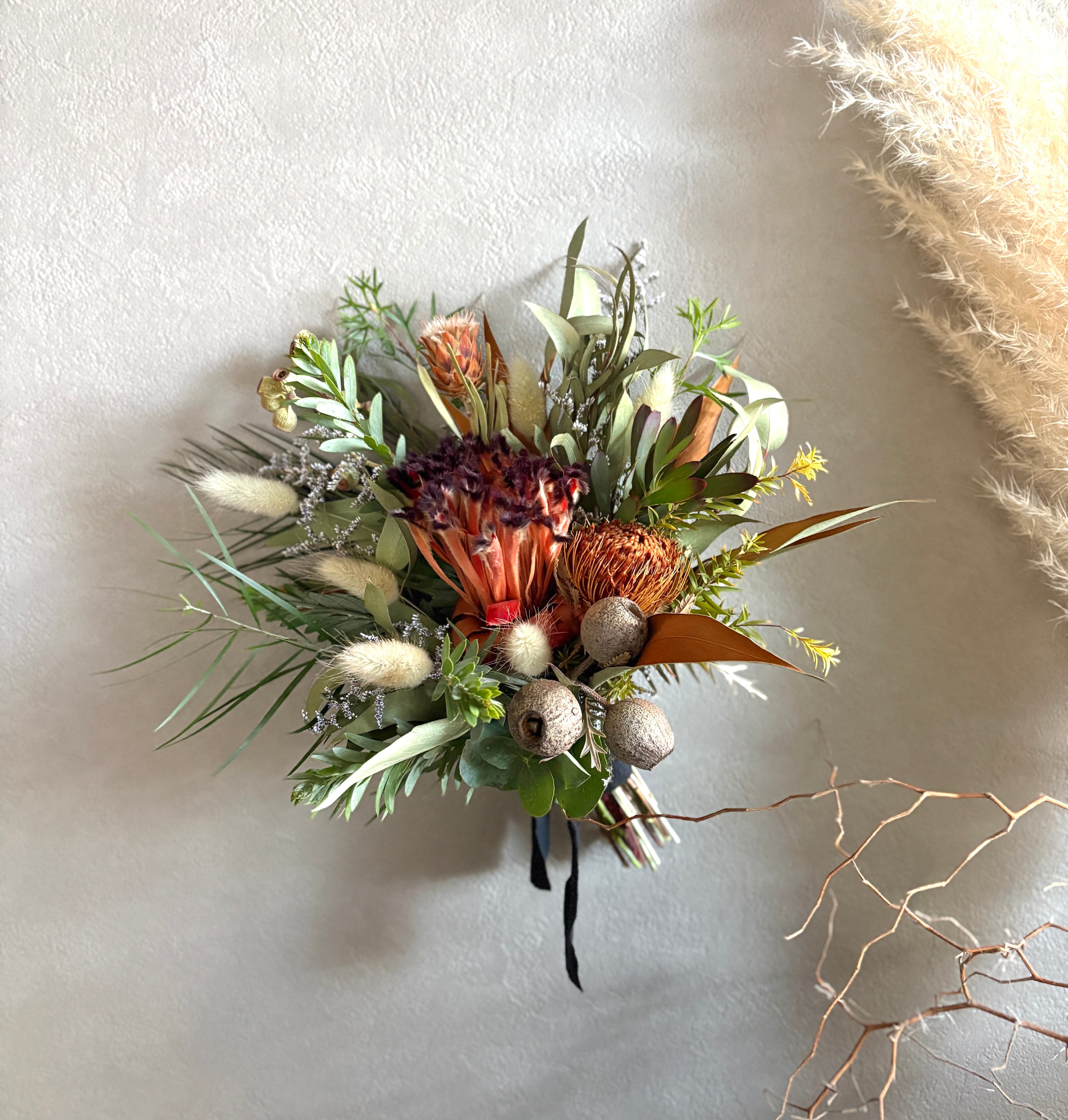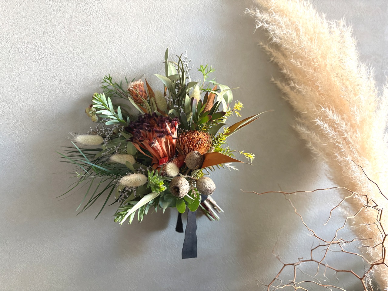 フォルモーサ、グレビレアゴールド、ベルガムナッツ、リューカデンドロンなどネイティブプランツもたっぷり束ねて、暖かみのあるスワッグに仕上げました。