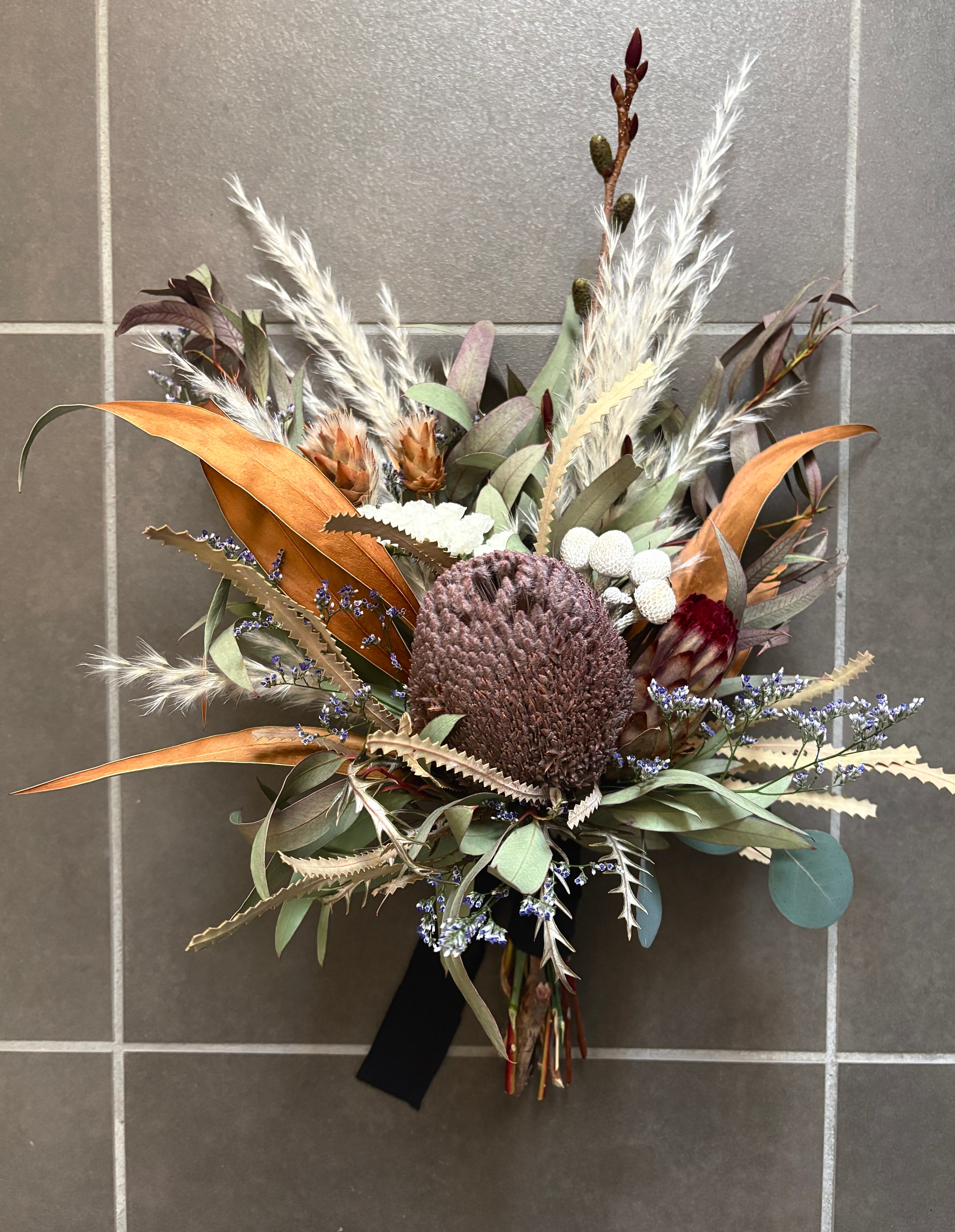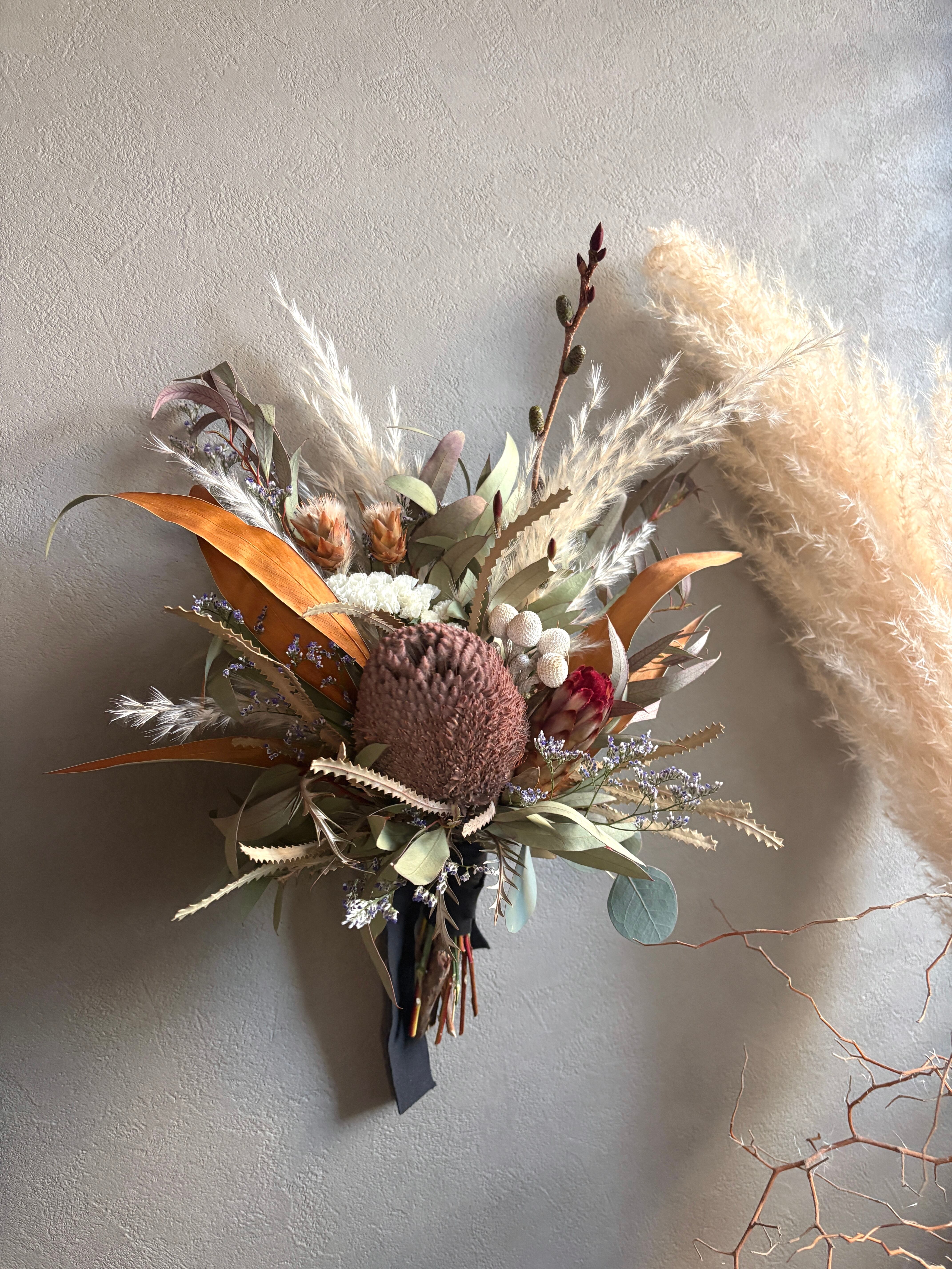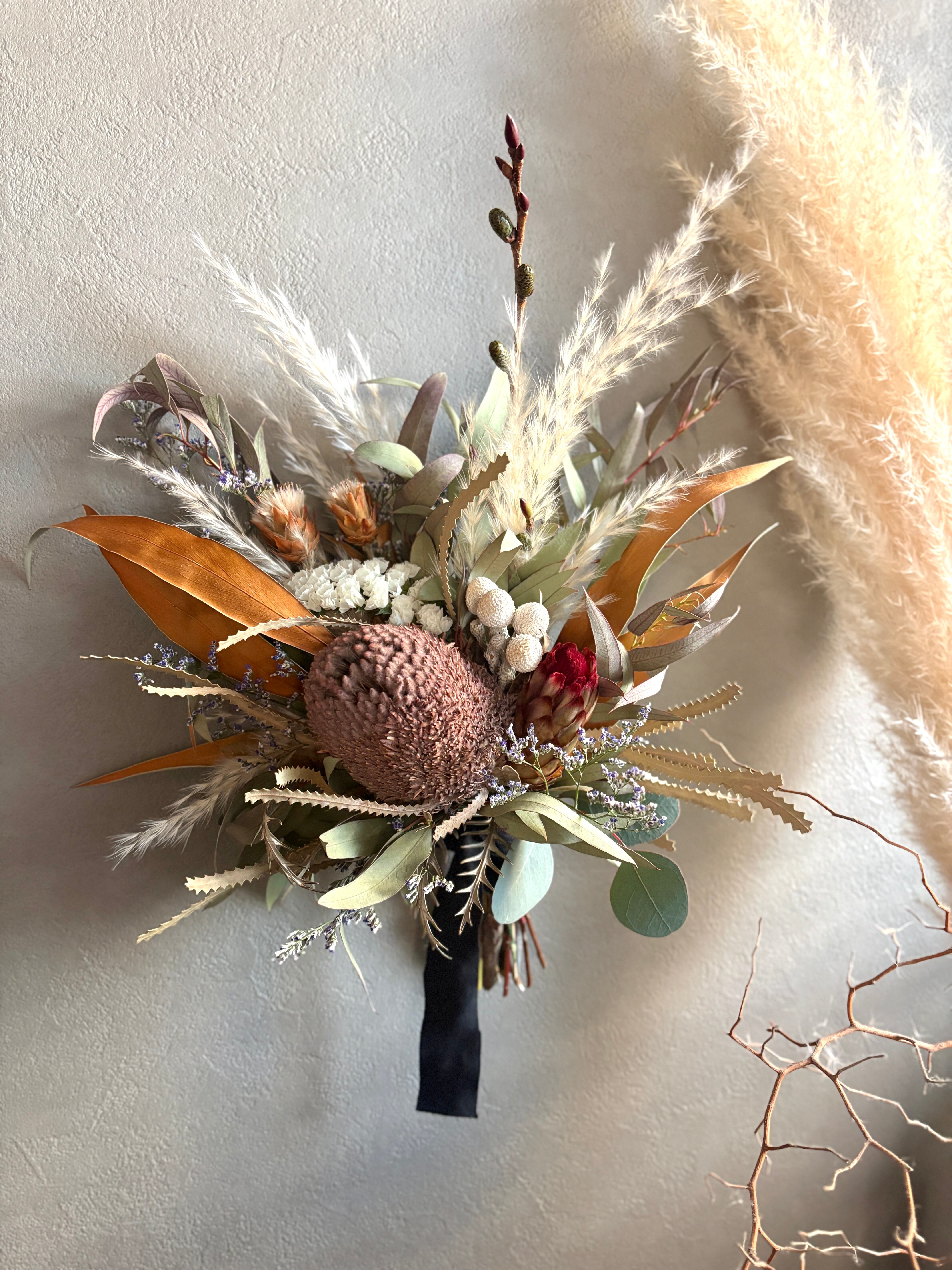 ユーカリをベースに、グレビレアゴールド、パンパスグラス、ブルニア、リューカデンドロンなどネイティブプランツをたっぷり束ねボリューム感のあるスワッグに仕上げました。
