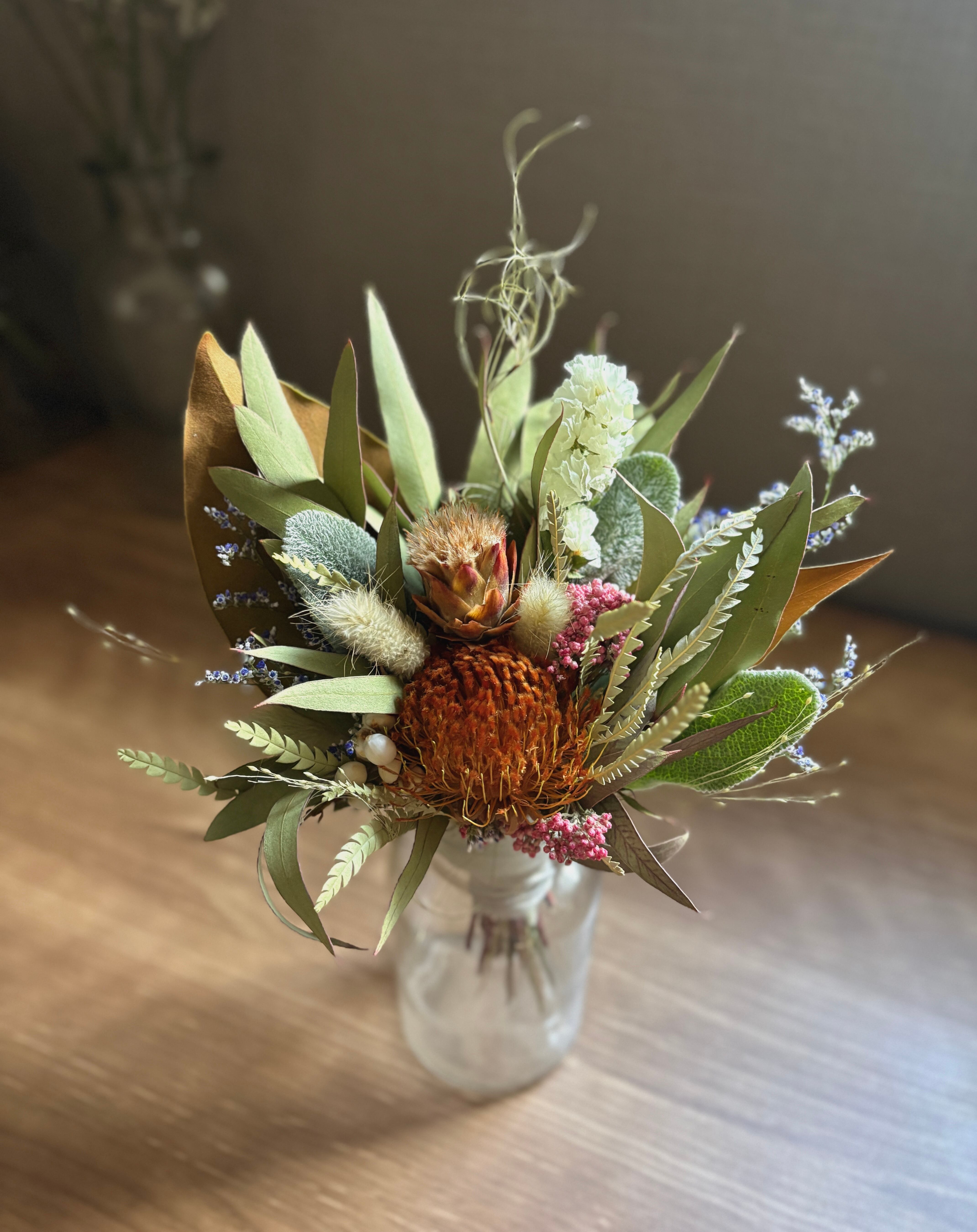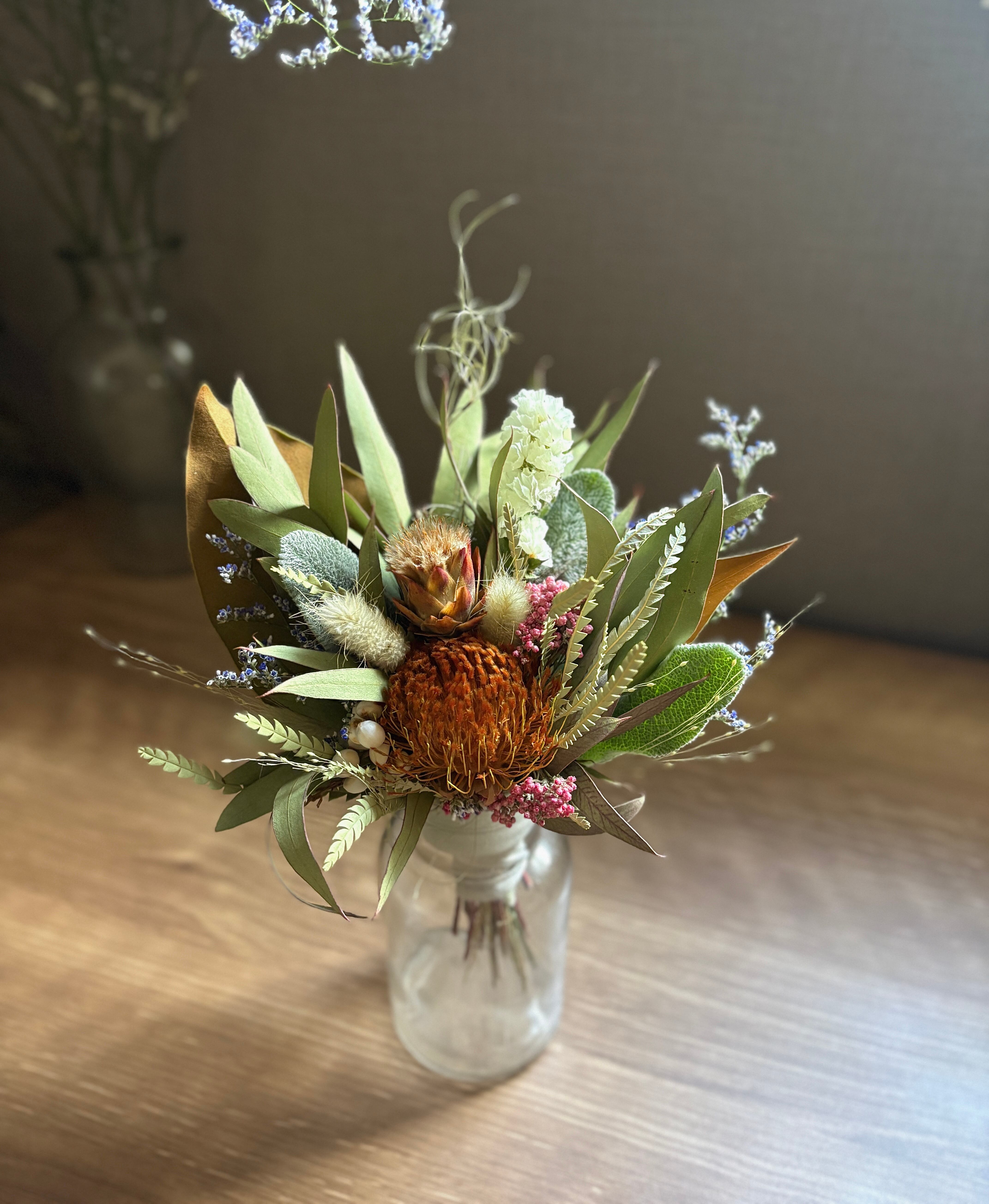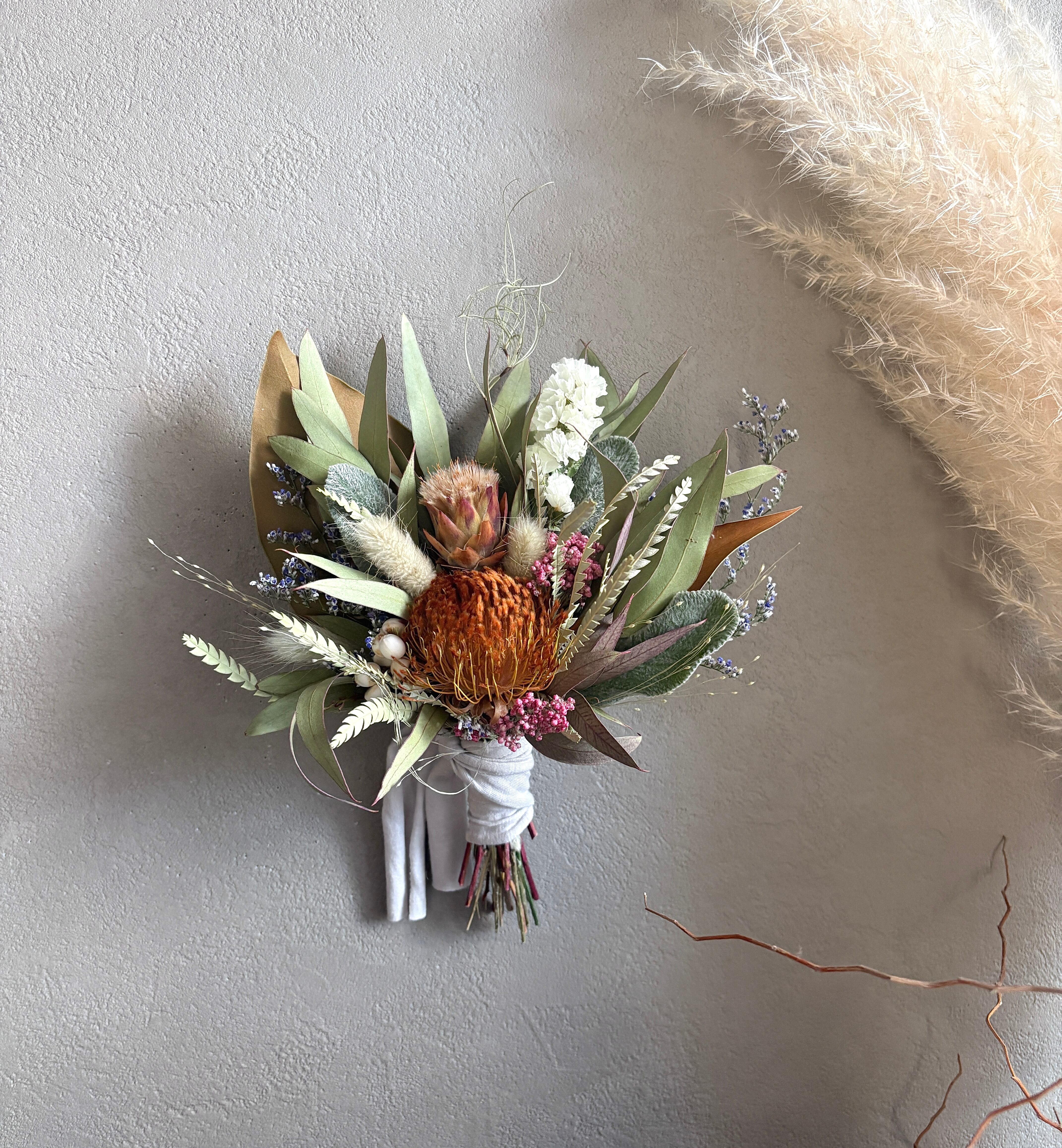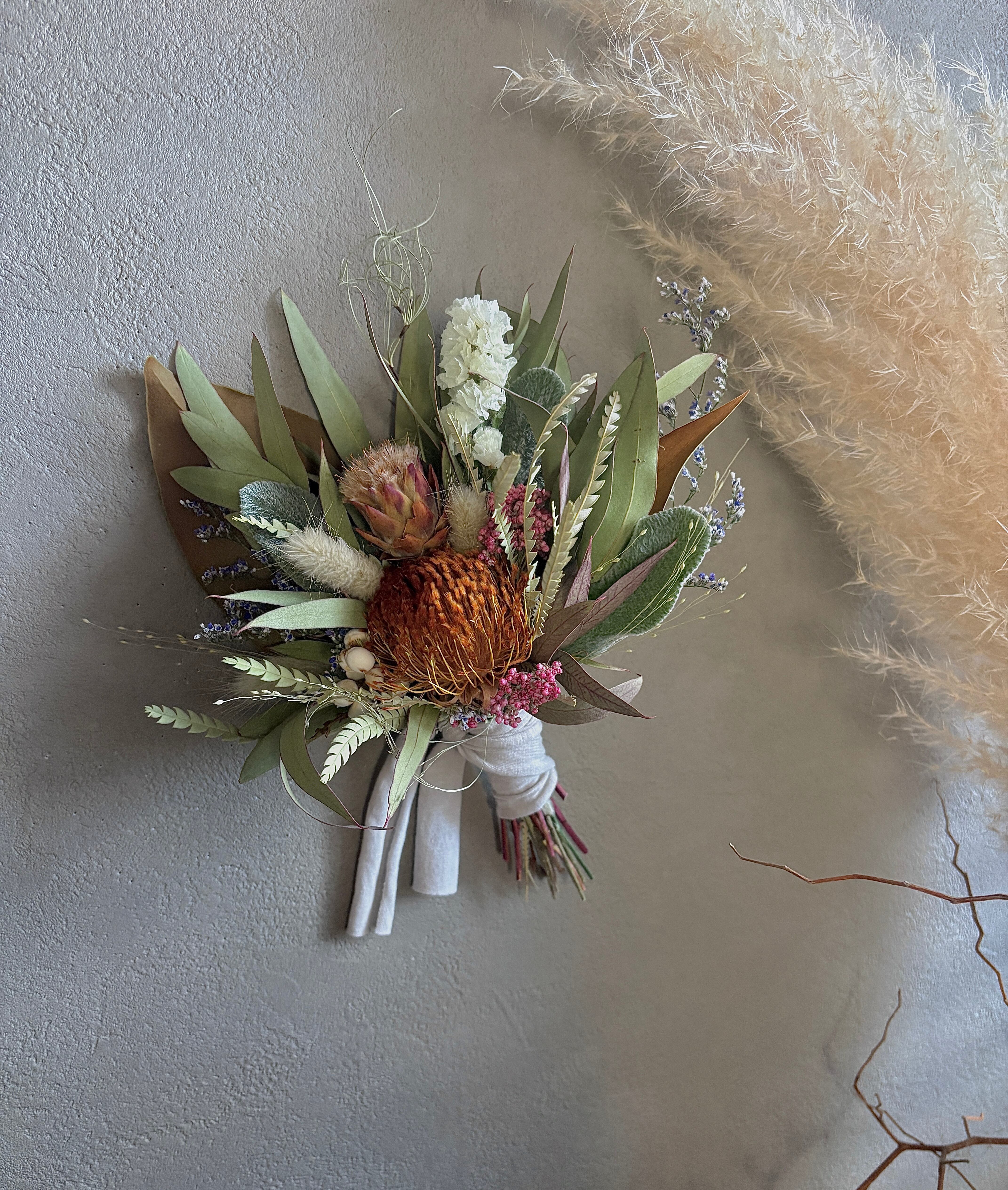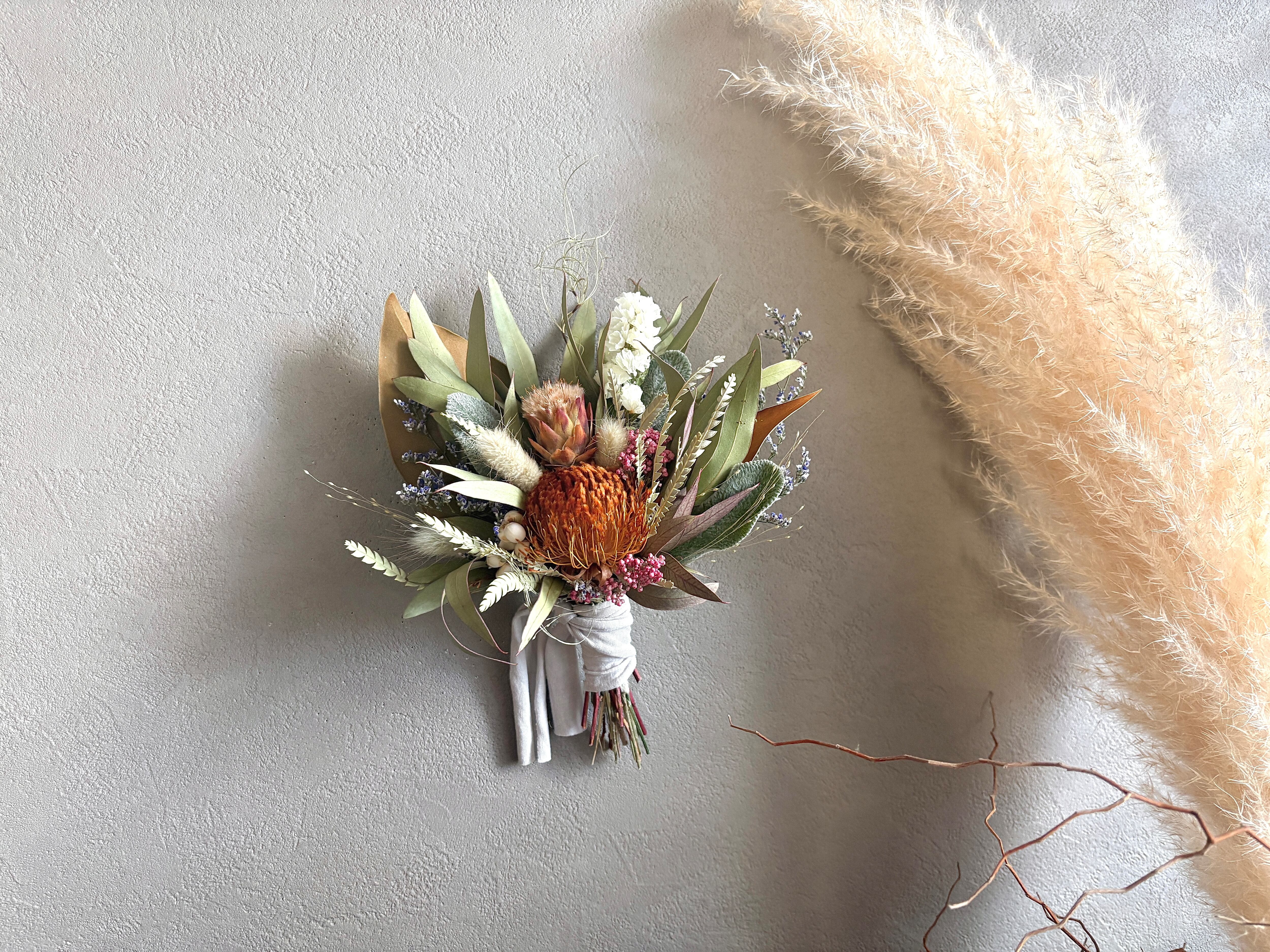 ユーカリをベースにフォルモーサ、リューカデンドロン、ライスフラワーなどネイティブフラワーをぎゅっと詰め込み、少し春を感じさせるコンパクトサイズのスワッグに仕上げました。