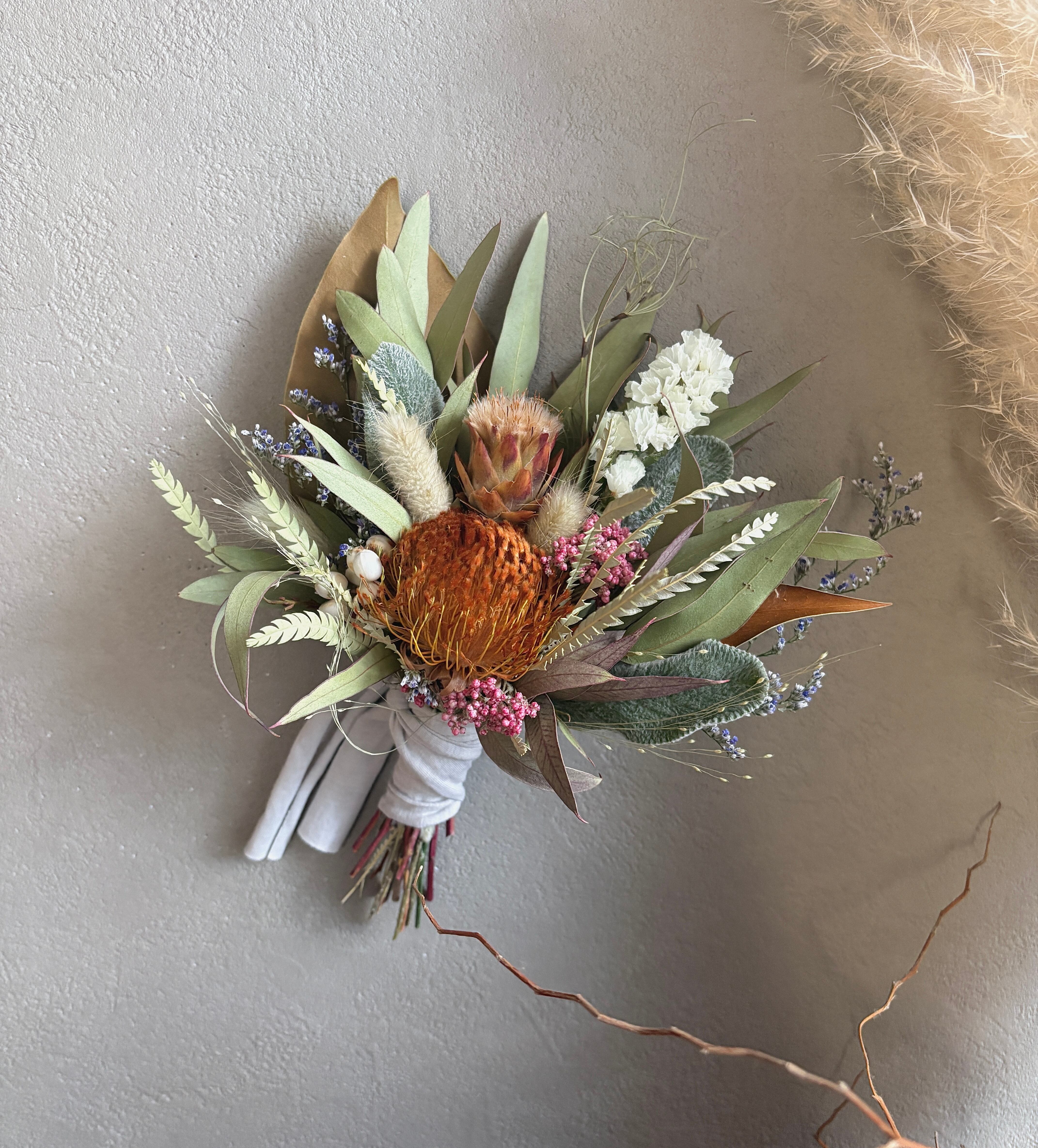 ネイティブフラワーとユーカリのスワッグ。