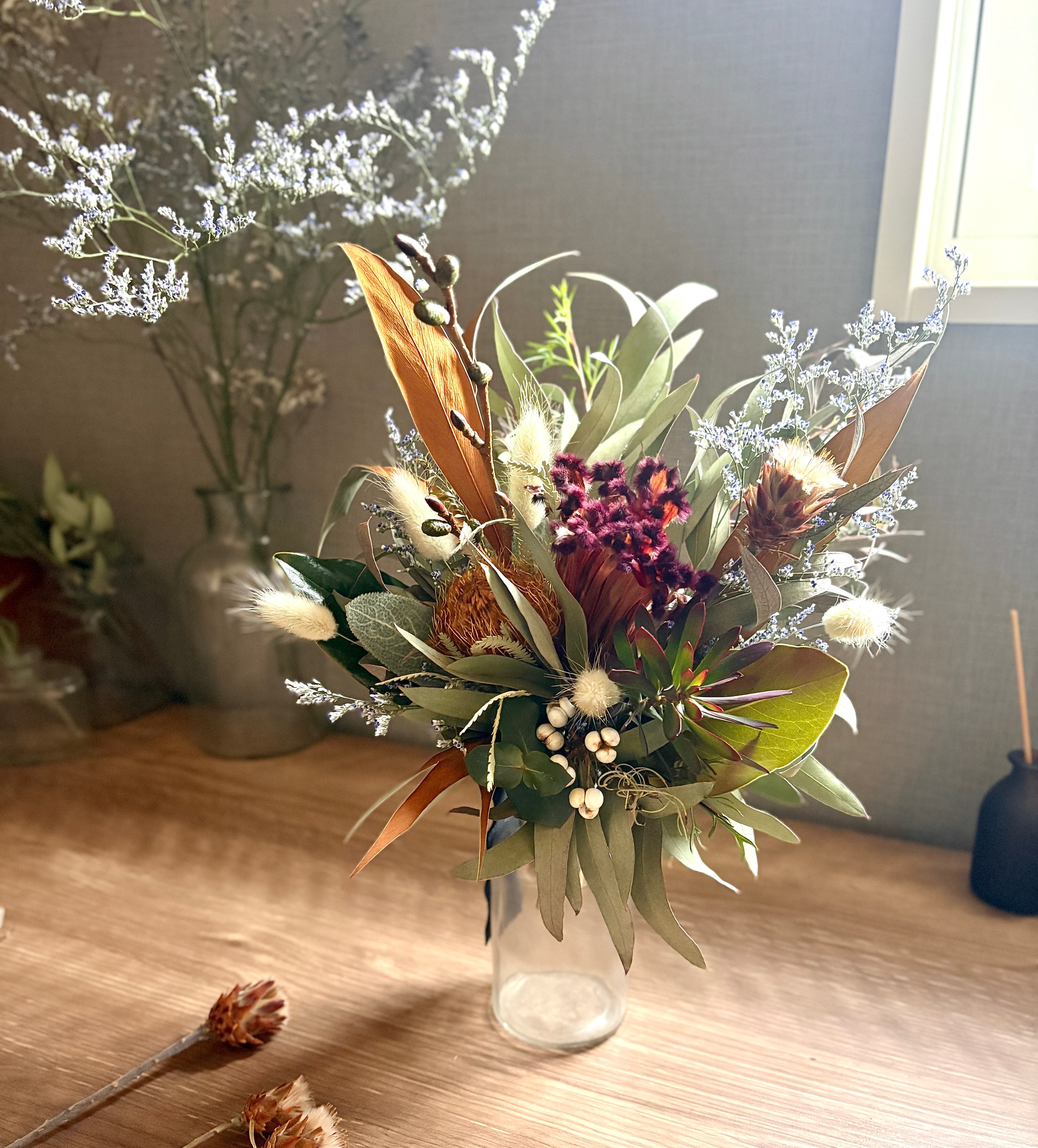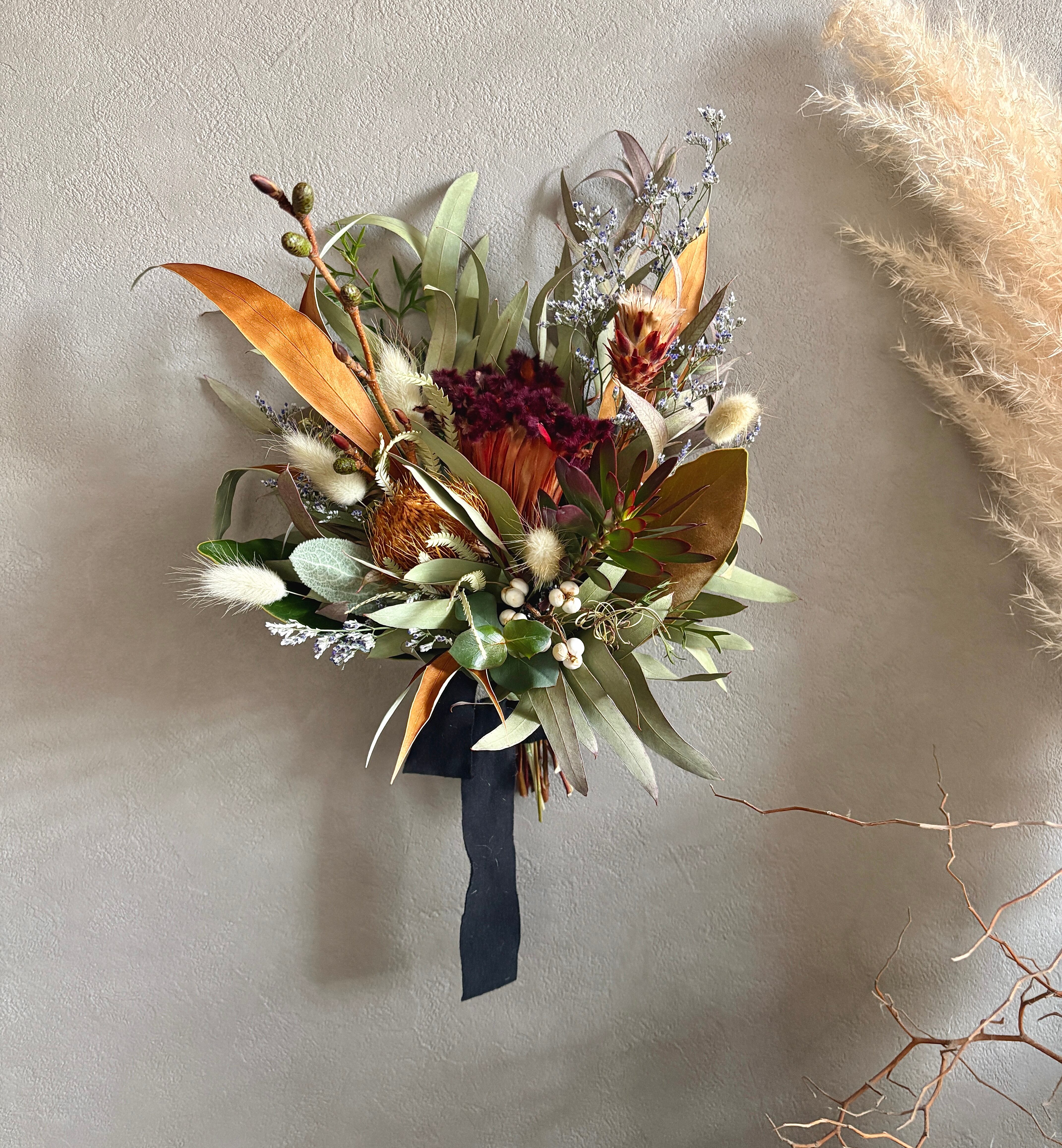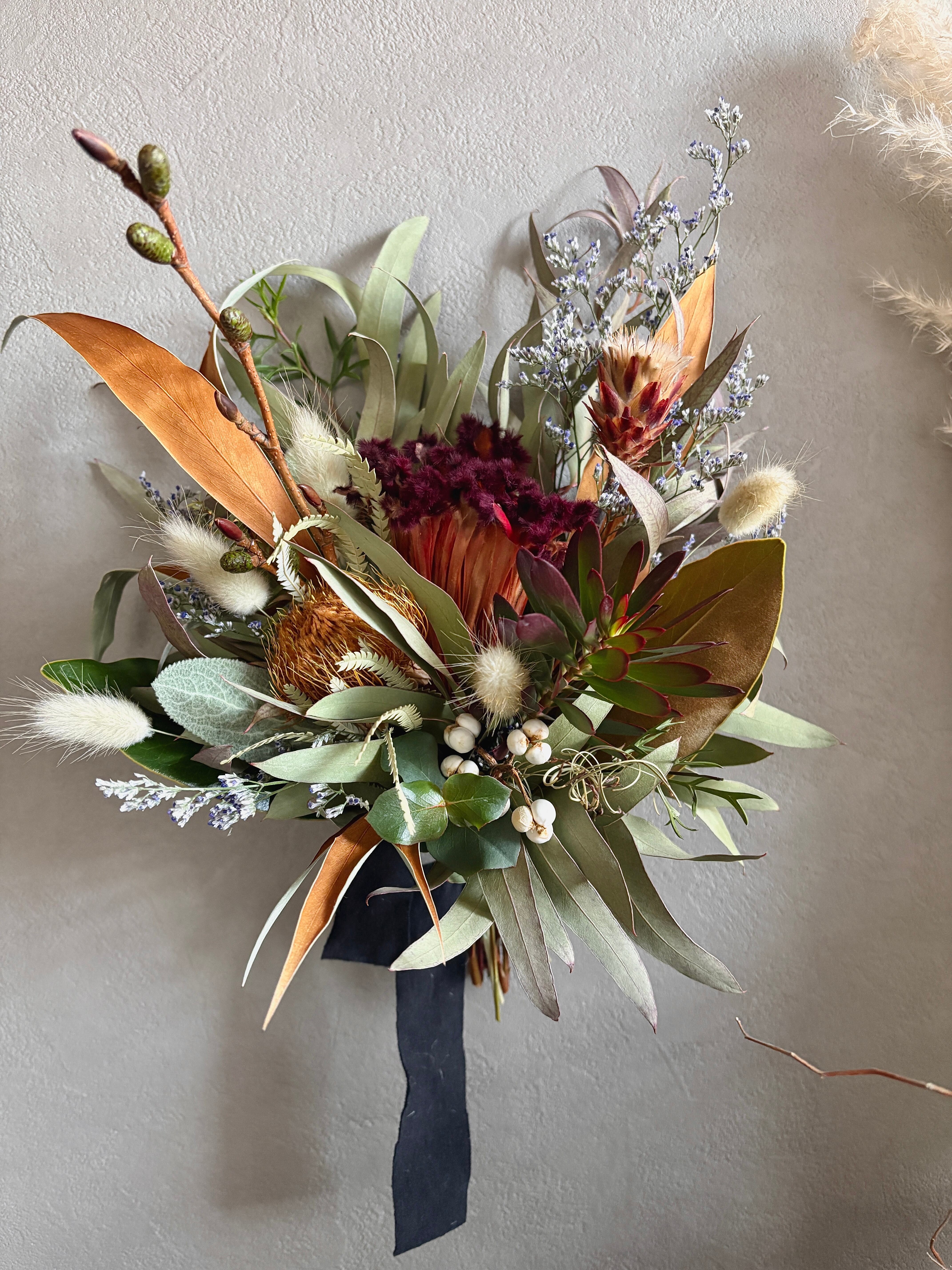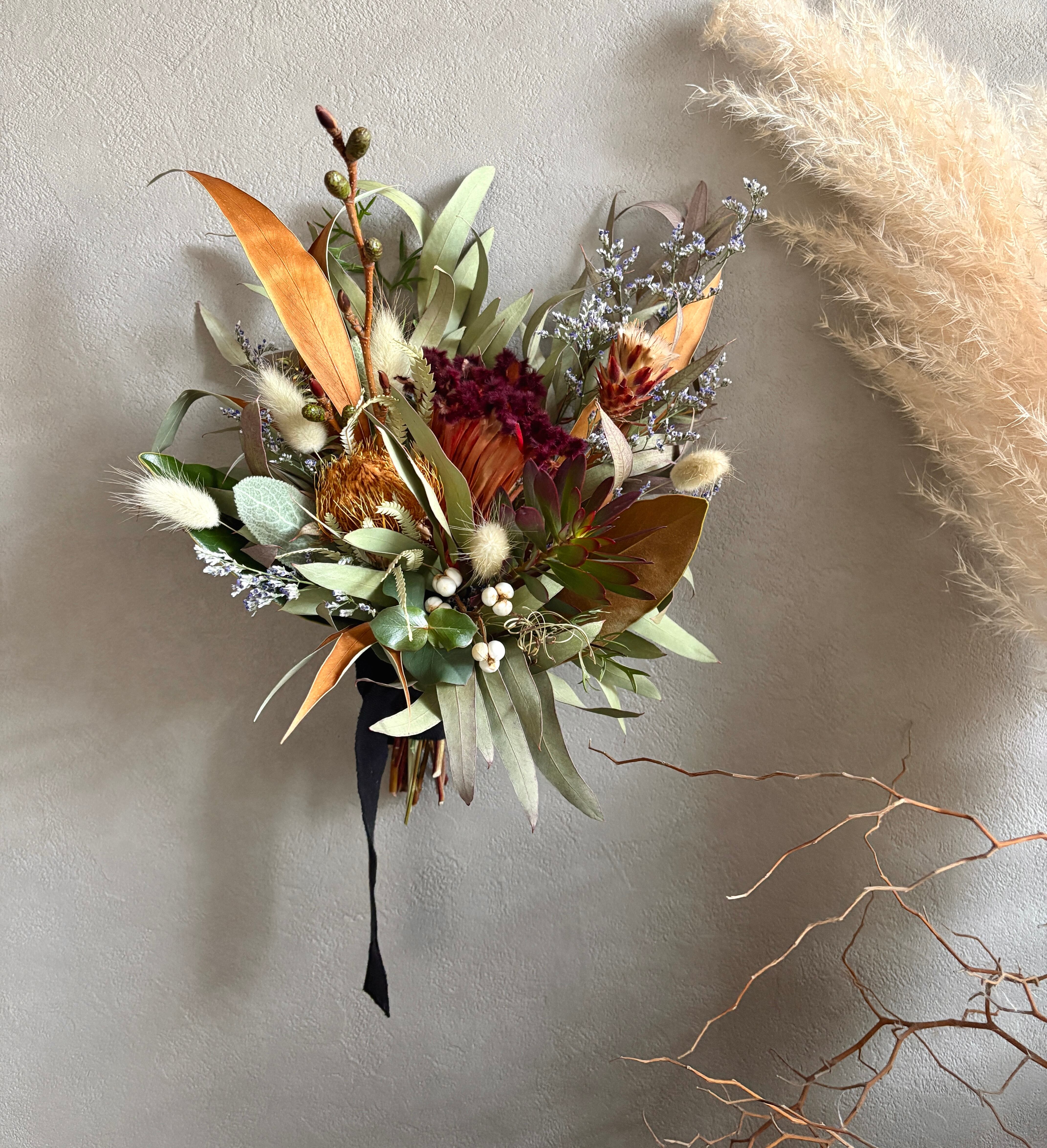 フォルモーサ、グレビレアゴールド、リューカデンドロンなどネイティブプランツをたっぷり束ねました。
