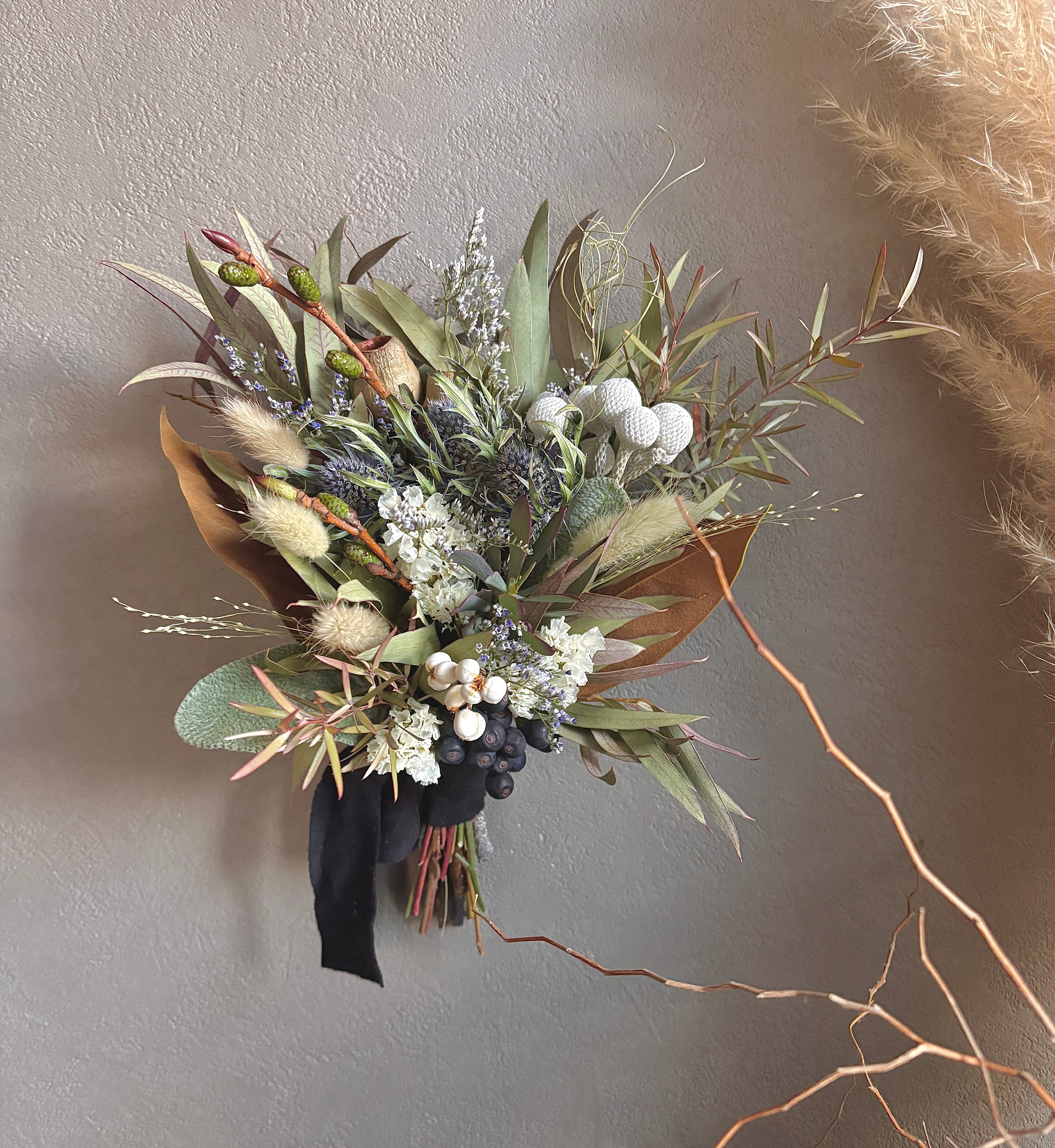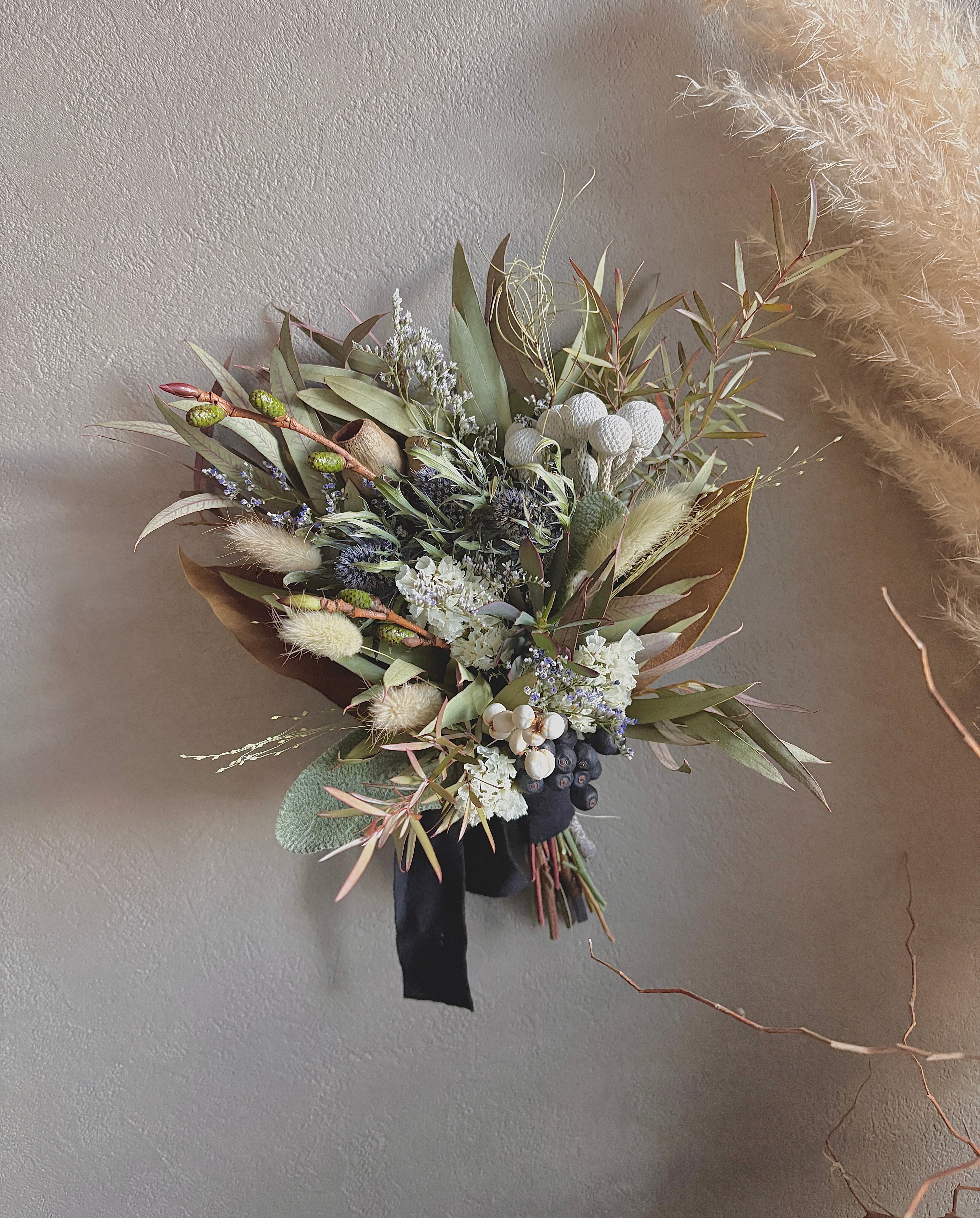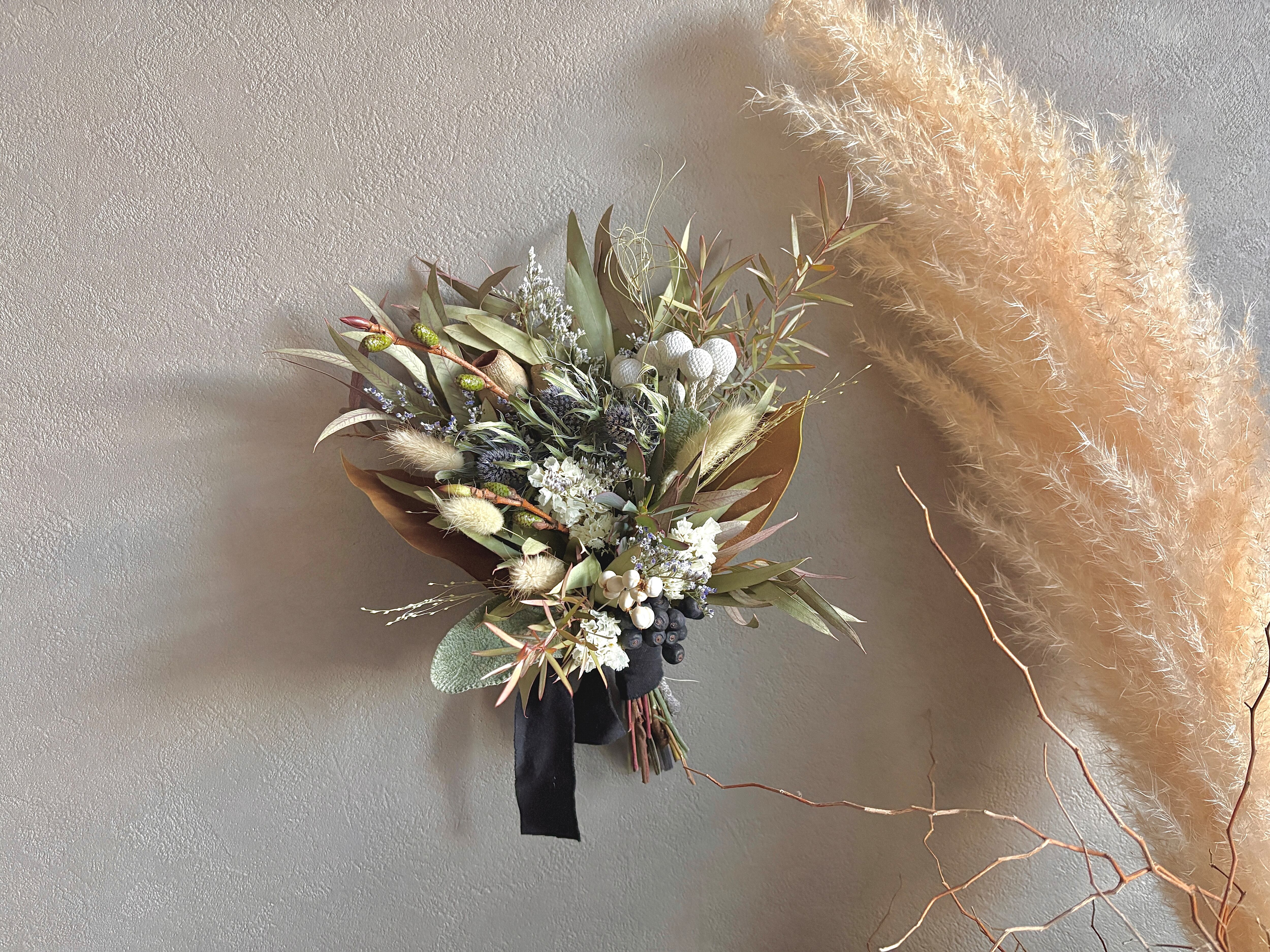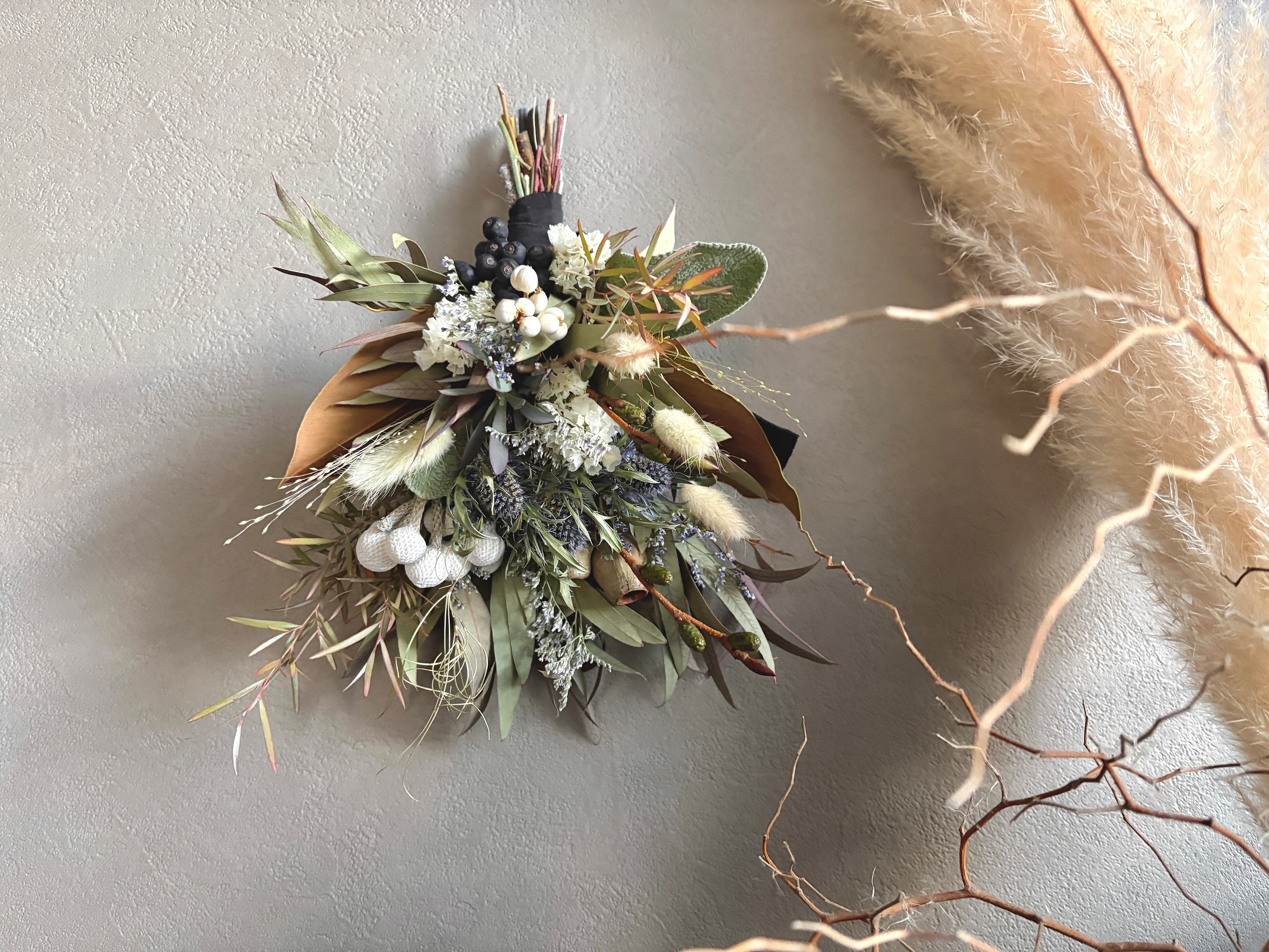 ユーカリのグリーンをベースにエリンジウム、ブルニア、ラグラス、ベルガムナッツ、マグノリアなど落ち着いた色味を合わせたスワッグです。