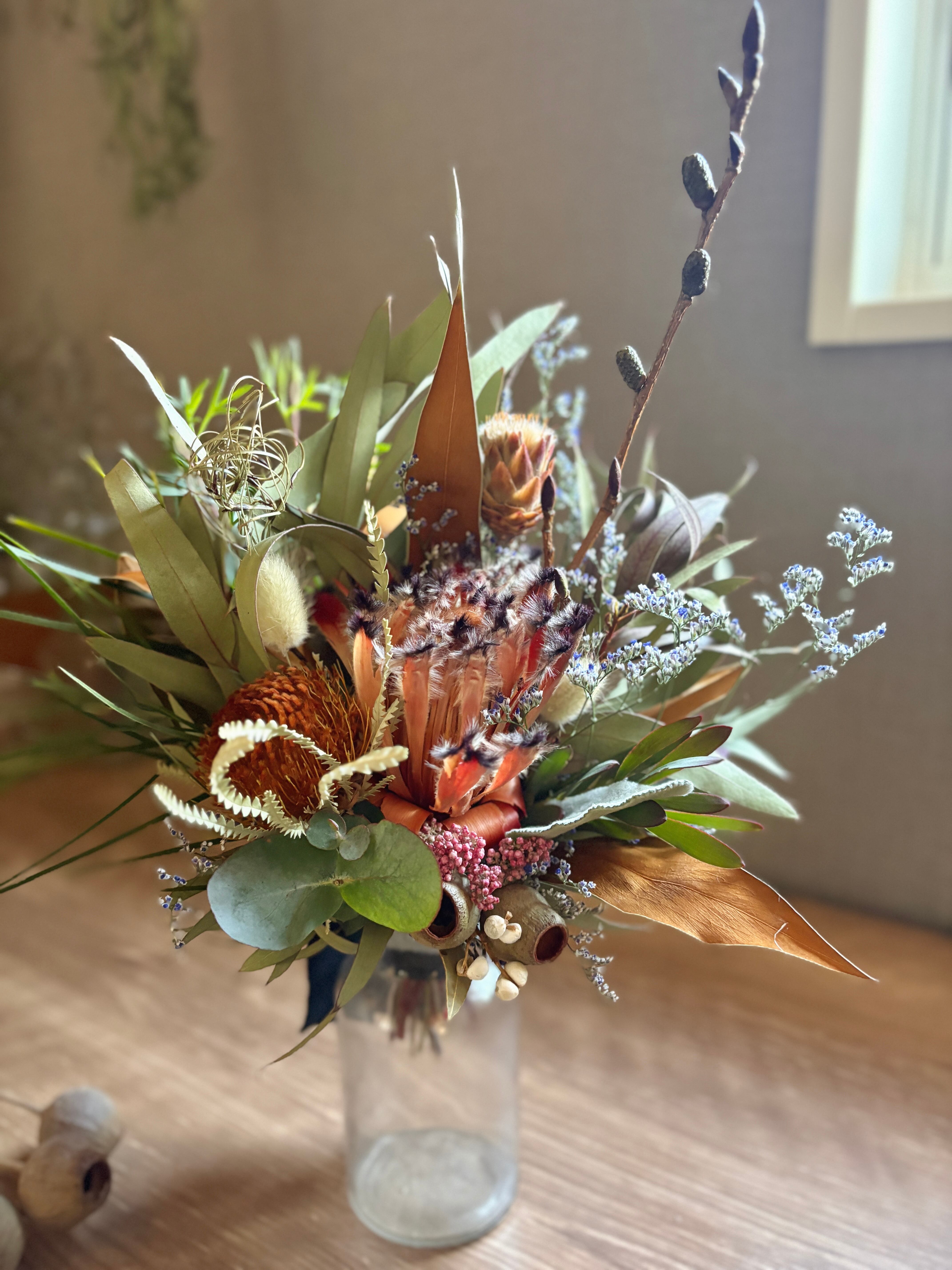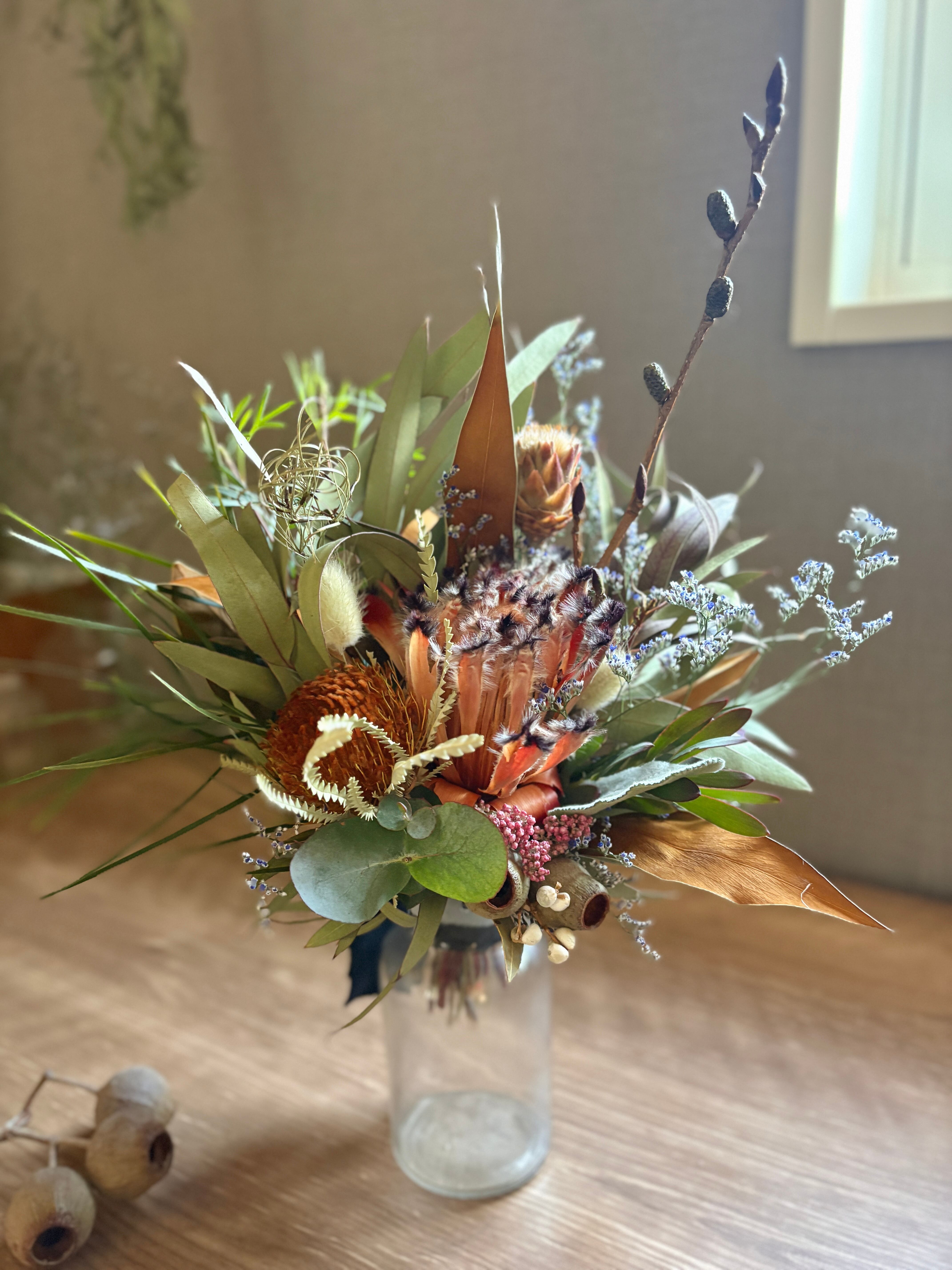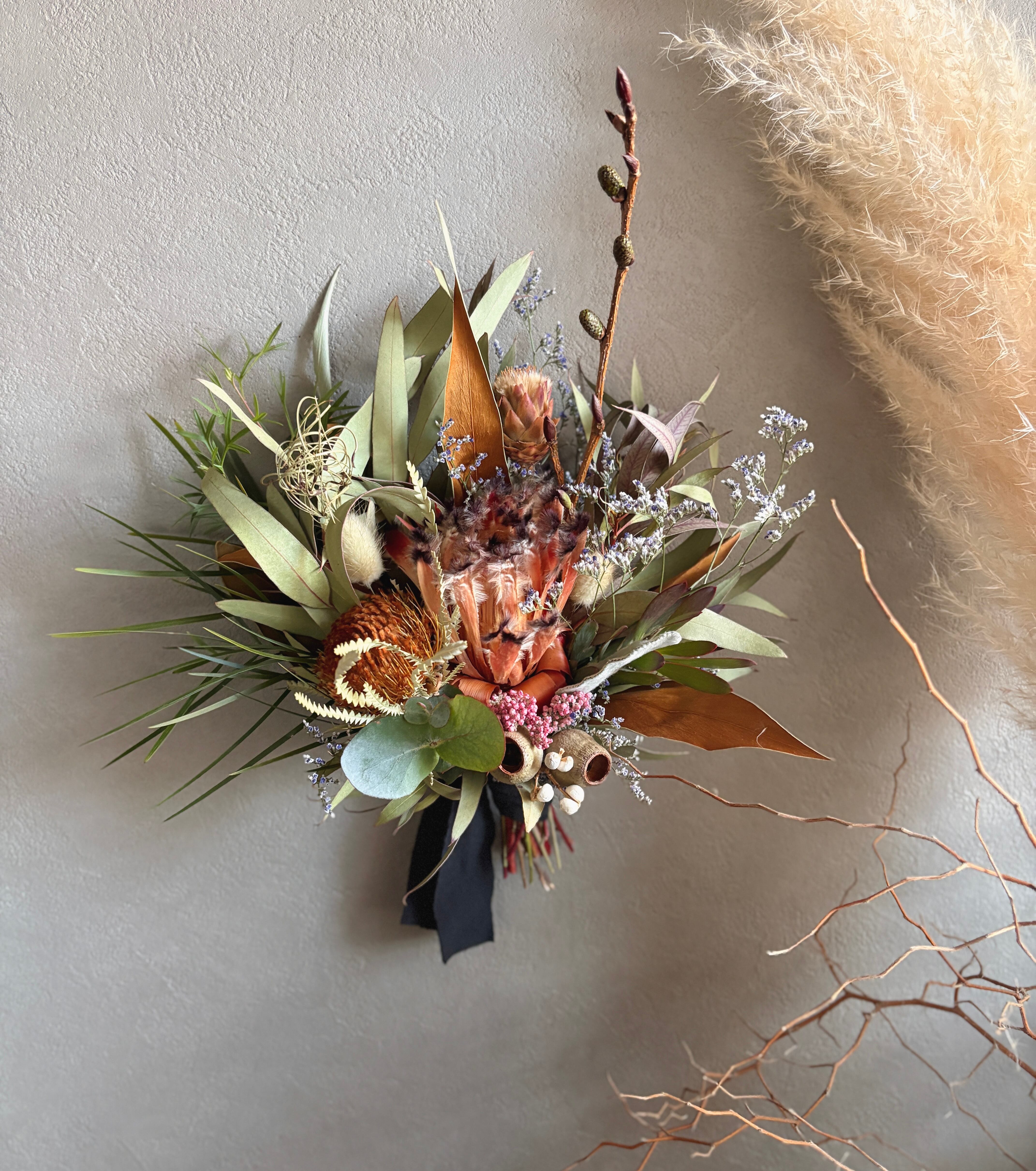 フォルモーサ、グレビレアゴールド、リューカデンドロン、ベルガムナッツなどネイティブプランツをたっぷり束ねました。