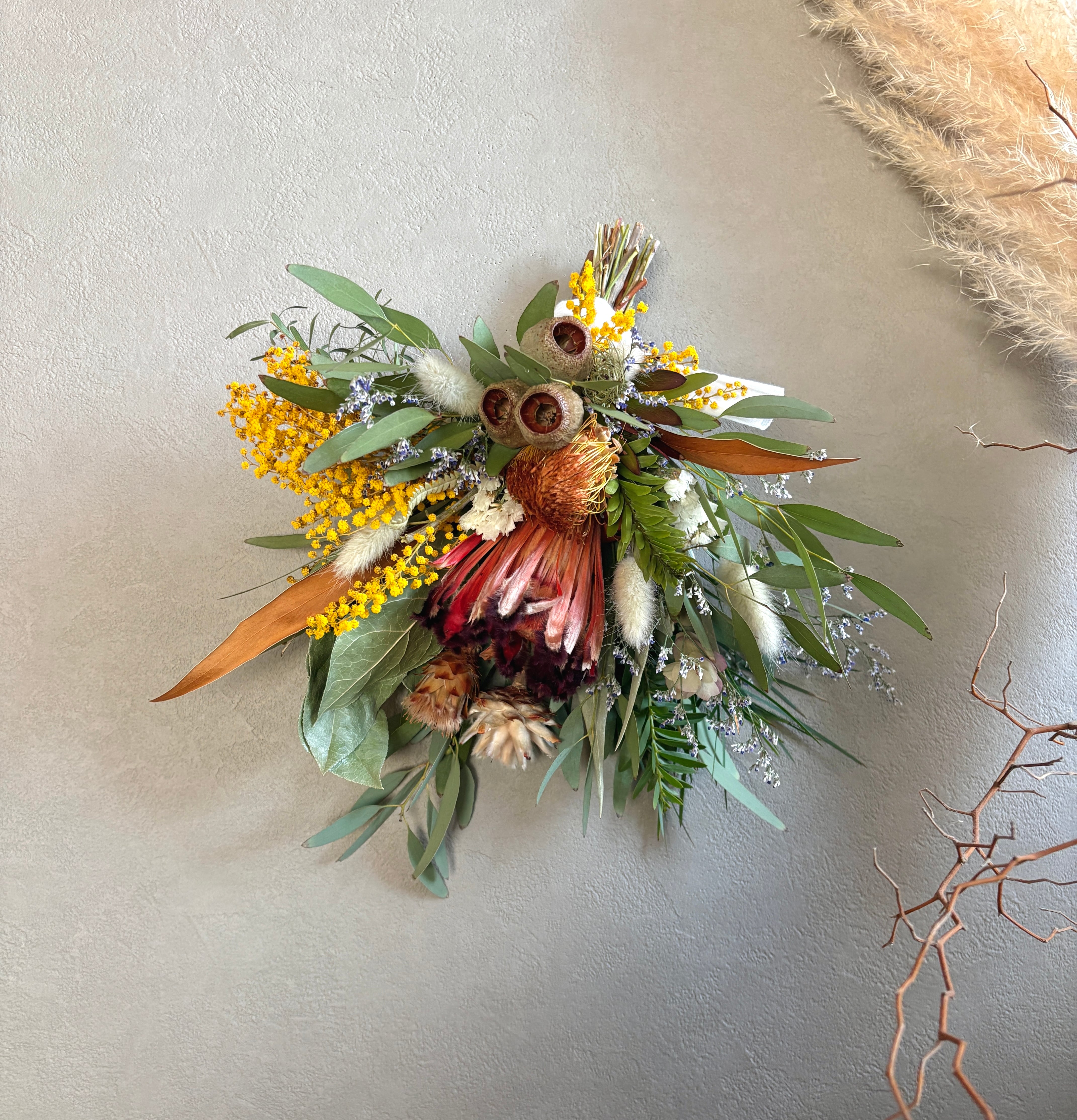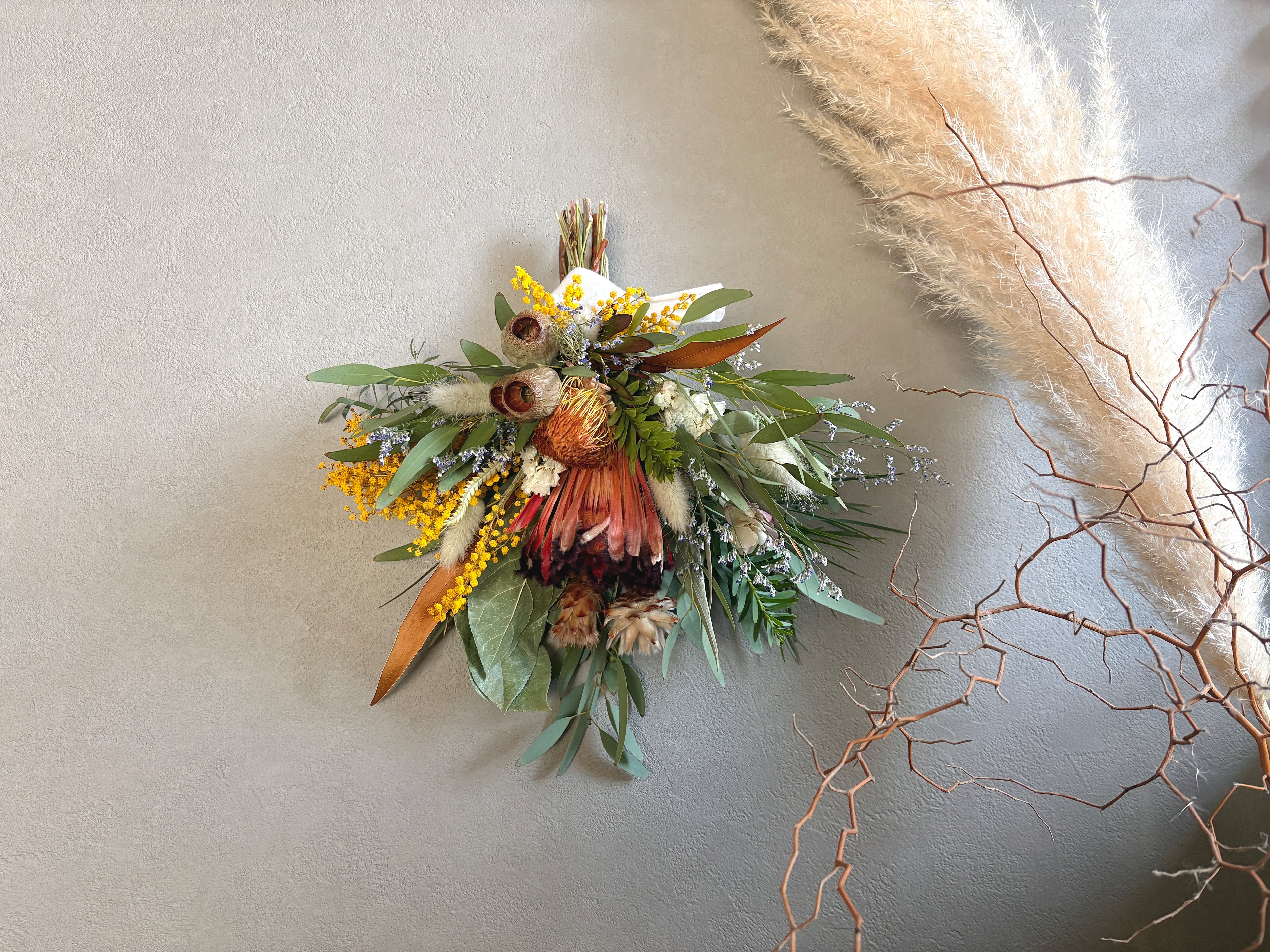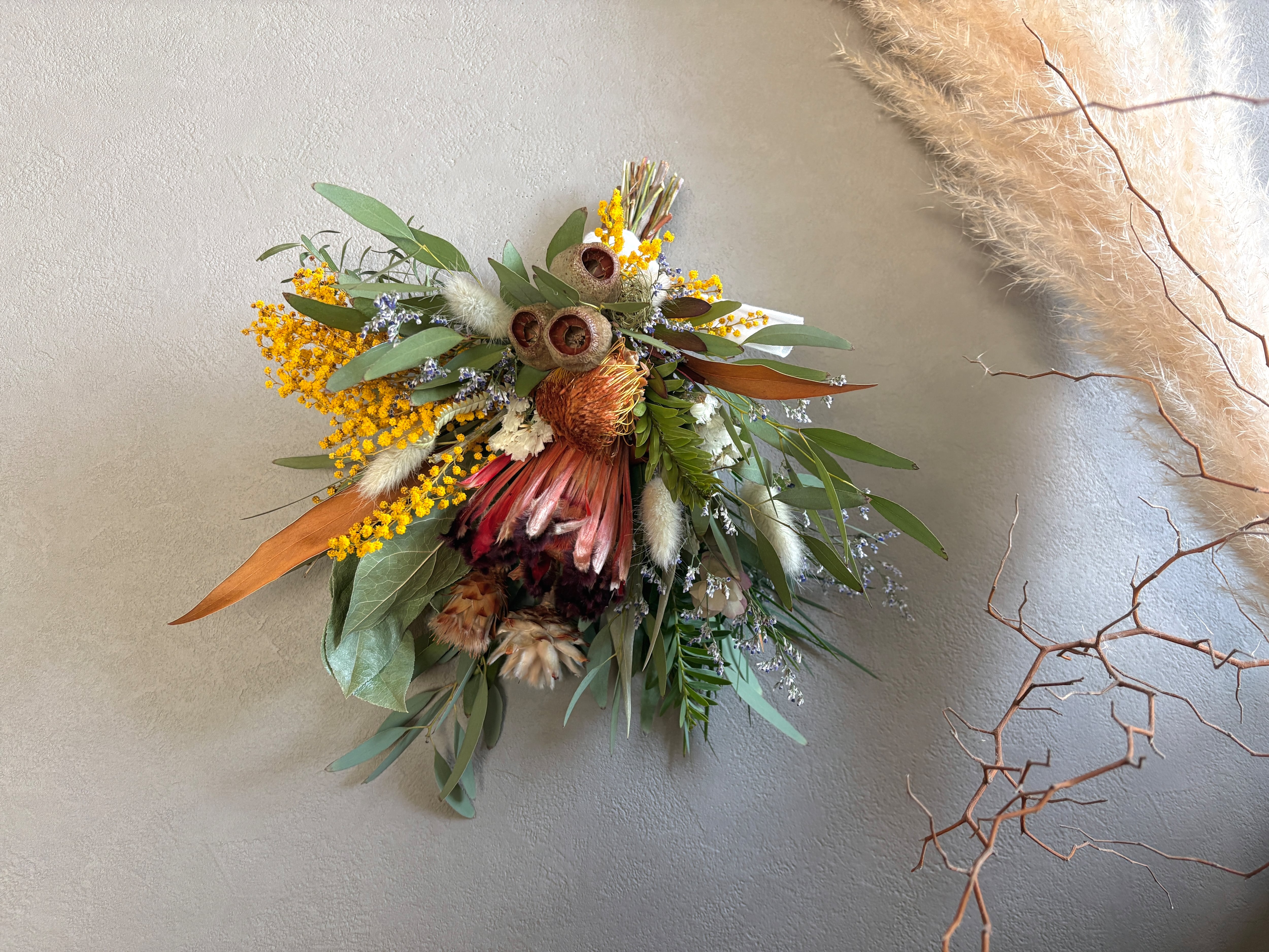 ユーカリやブルーブッシュ、レモンリーフなどのグリーンをベースに、プロテアやミモザ、フォルモーサ、リューカデンドロン、ベルガムナッツなどネイティブフラワーを束ねた春らしい華やかなスワッグです。