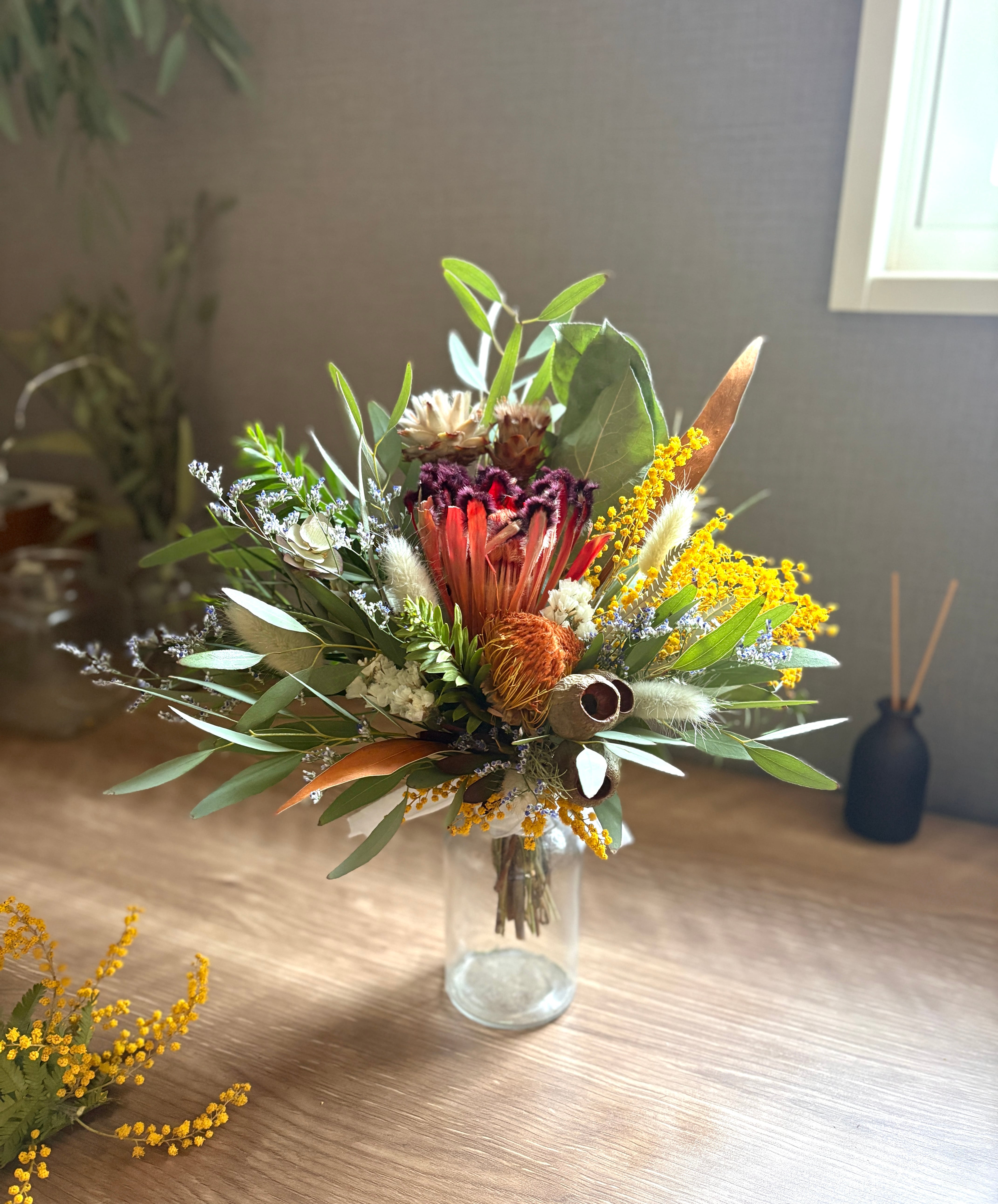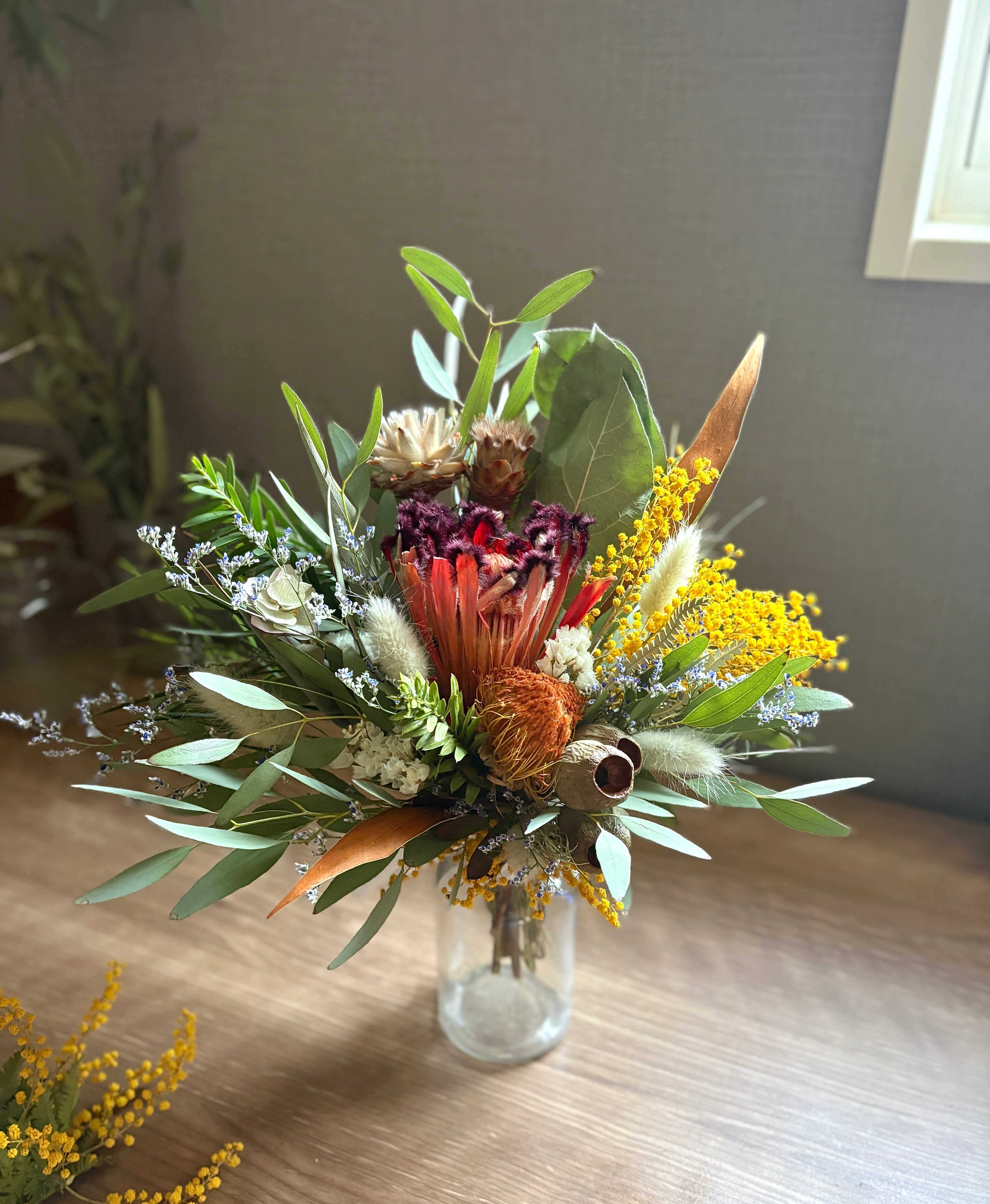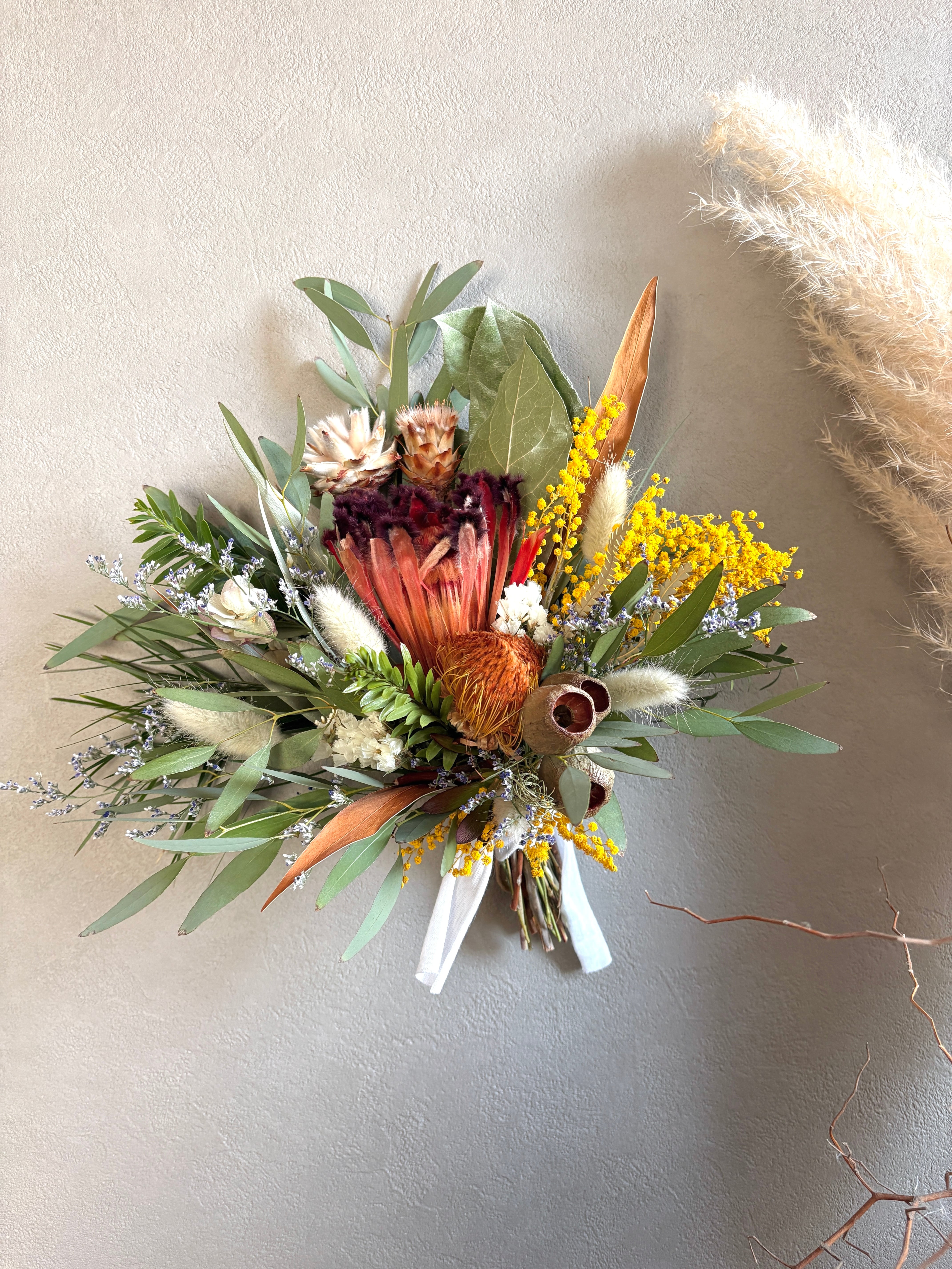 ユーカリやブルーブッシュ、レモンリーフなどのグリーンをベースに、プロテアやミモザ、フォルモーサ、リューカデンドロン、ベルガムナッツなどネイティブフラワーを束ねた春らしい華やかなスワッグです。